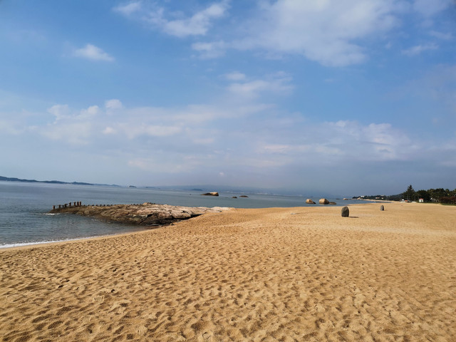 相比较白城沙滩,我更喜欢黄厝海滩的质感。漫长岁月里海水的耐心打磨,使得黄厝海滩的沙更显细软、自然,一片柔和,轻轻踩上去,竟像是触摸到婴儿的脸颊,绵绵的,带着肌肤的嫩滑,让人不忍拔脚离开。