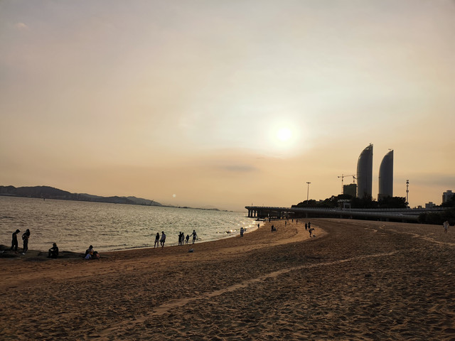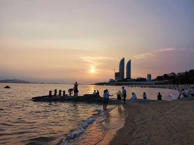 沙滩很长,也很美,尤其是夕阳西下时分。晚霞,大海,演武大桥,双子塔,独属厦门的印记,日复一日上演着鹭岛绝美大片。