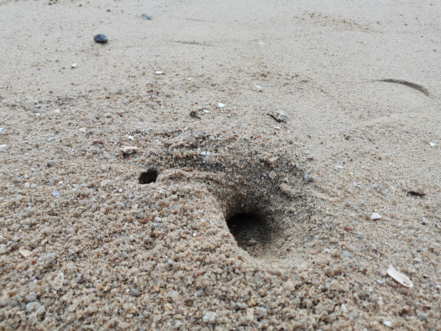 被人遗忘的扇贝壳,沙地钻洞的皮皮虾,绽放的五爪金龙,都是人间的小精灵。
