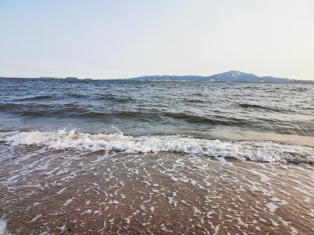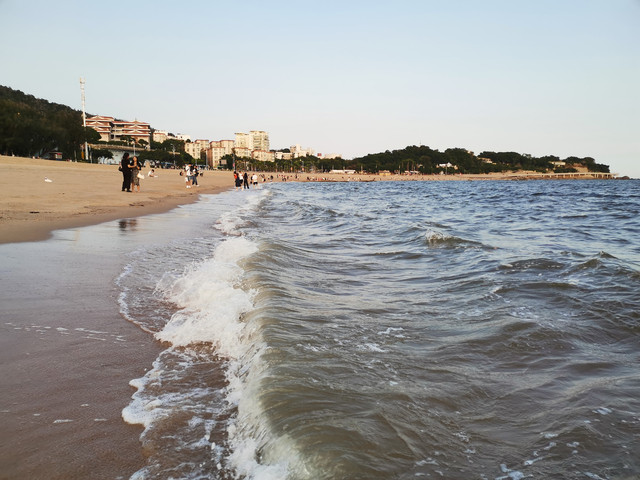 波涛匀缓地舔舐着沙滩,发出一阵阵微弱的哗啦声,像是交响乐团里自由速度的吊镲的乐音。后退的前浪与紧随的后浪相撞,在空中溅起一朵朵凌乱的小浪花,因为光的折射,偶尔还能看到迷你小彩虹。水沙分界线上,留下一道一道的白色泡沫。