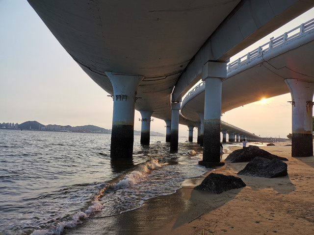 白城沙滩的位置可谓得天独厚。车来车往的大学路对面,是充满人文气息的厦大校园。步行去南普陀寺也不过十来分钟路程。百米开外矗立着厦门地标双子塔,形似航海中的风帆,已然成为白城沙滩视觉空间里浑然一体的构成元素。演武大桥绕过了双子塔,绕过了沙滩,绕过了厦大,像一条空中巨蛇,呼啸而来,绝尘而去。
