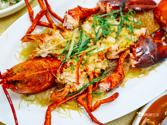 清蒸波士顿龙虾,下面垫的粉丝也不容错过,吸收了龙虾的鲜味Q弹爽口,龙虾肉紧致Q弹。
