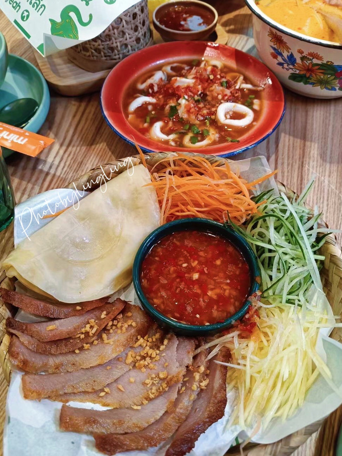 炭烧猪颈肉卷卷拼盘:猪颈肉劲道而不柴,加入自己喜欢的配菜,蘸上酱料,用薄薄的饼皮卷起来,大口咬下,层次丰富而爽口。