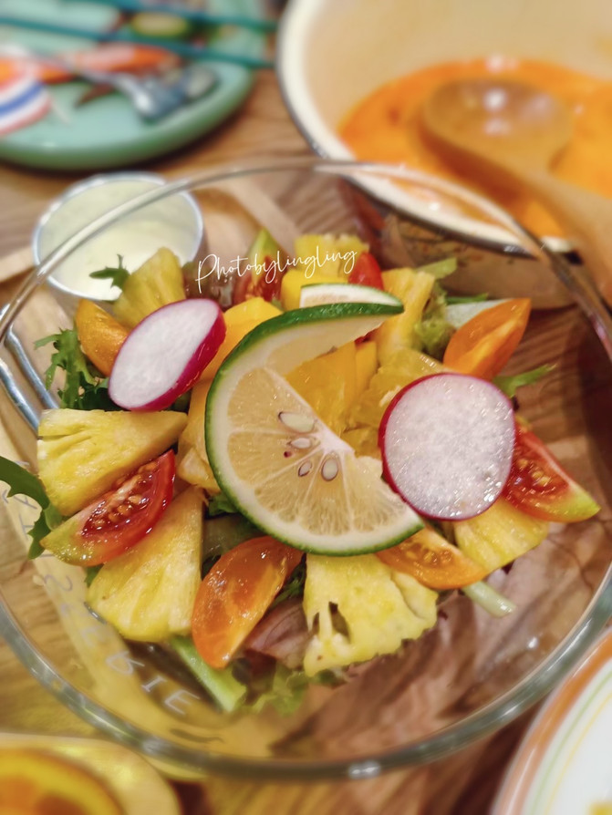 在迷你椰好吃得太多了。满满一桌让人赏心悦目,这热情的颜值和香气真的把人给香迷糊了。最后女生们少不了的果蔬沙拉:有多种新鲜蔬菜和水果,营养丰富,天然健康。