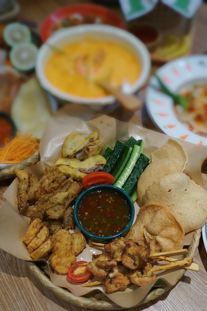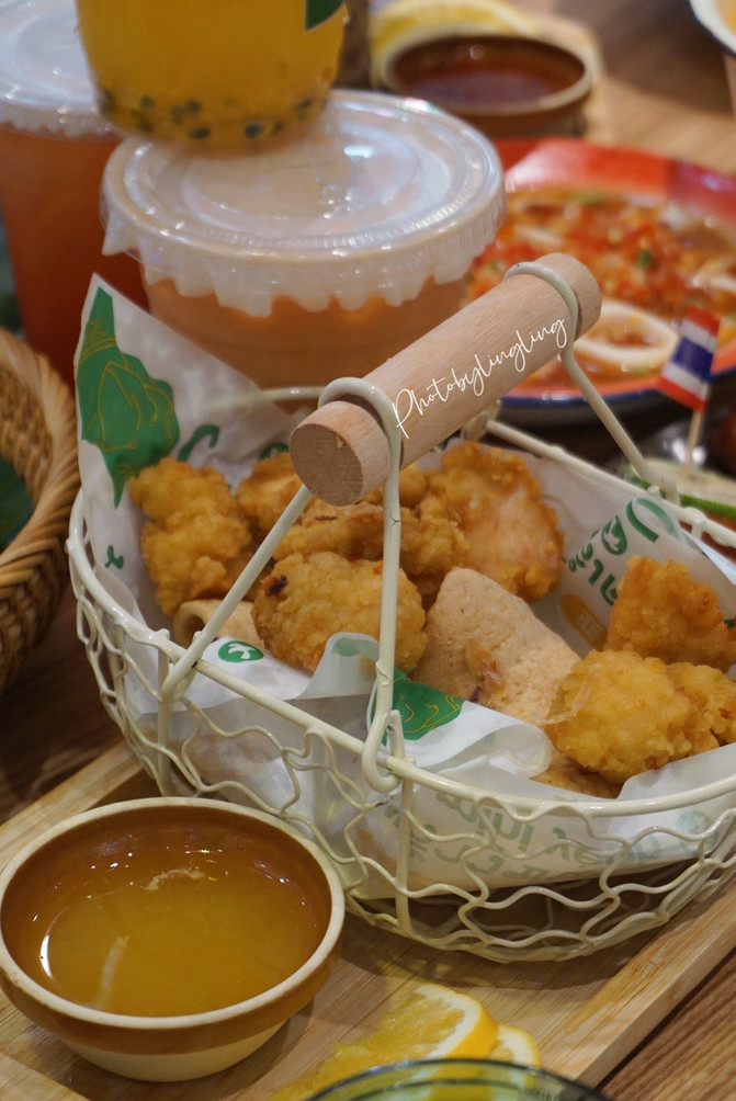 市场招手停炸食拼盘:特别有带入感,仿佛来到泰国水上市场,招招手叫住摆摊的小船,点上一堆炸食,炸肉串、炸鸡、炸鱼、炸虾片,再搭配了黄瓜条、圣女果等时蔬,蘸着特别的酱汁,好吃到吃到停不下来。