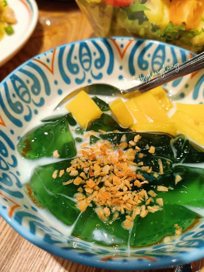 椰奶芒果香兰冻:香兰冻晶莹剔透,香气特别,配着浓浓的椰奶,香甜的芒果,真是惊艳到了!