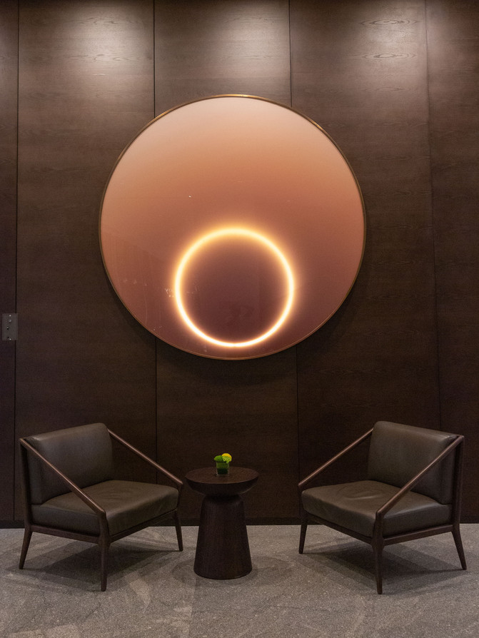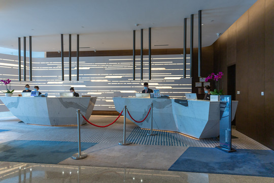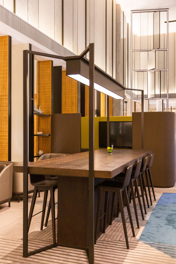 酒店的前台采用船身造型设计,而顶上的灯宛如桅杆和烟囱,背景似海上环绕的云烟。