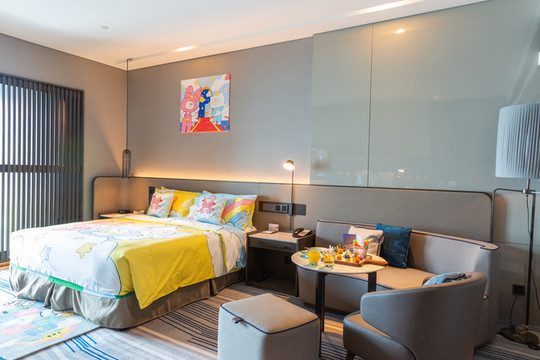 我们订的是豪华儿童海景大床房,一进门小朋友就在床上蹦蹦跳跳了。亲子客房引用了皇冠假日品牌的亲子IP:皇冠家族;缤纷梦幻的卡通帐篷、床品、游戏垫;将皇冠家族伙伴们的元素融入每一个细节,让宝宝在童趣的氛围里,酣睡入眠!