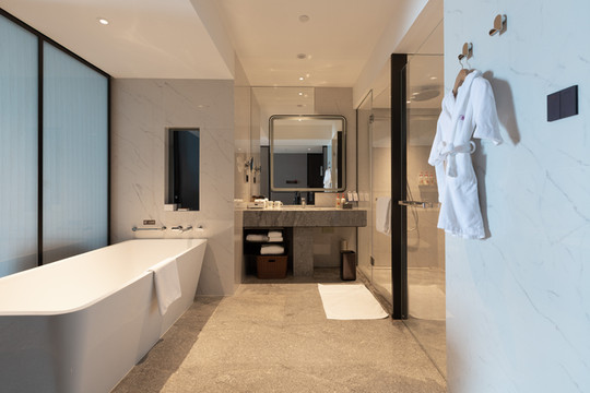 洗浴用品选用了以天然矿物温泉活肤为理念的贝佳斯,开放式浴缸空间,兼容了干湿分离的卫浴空间。
