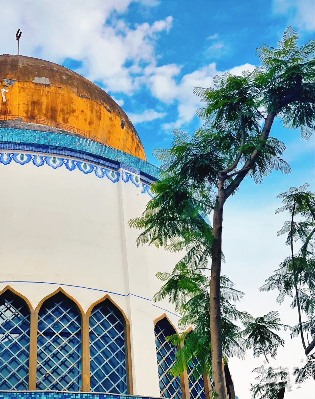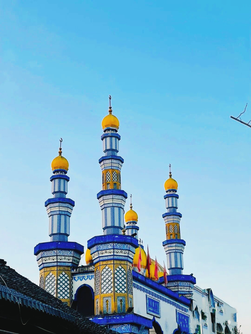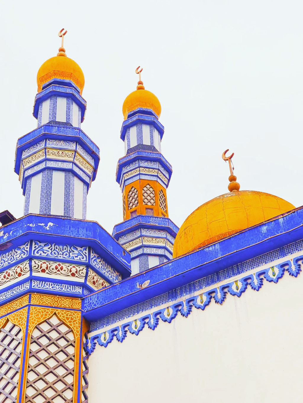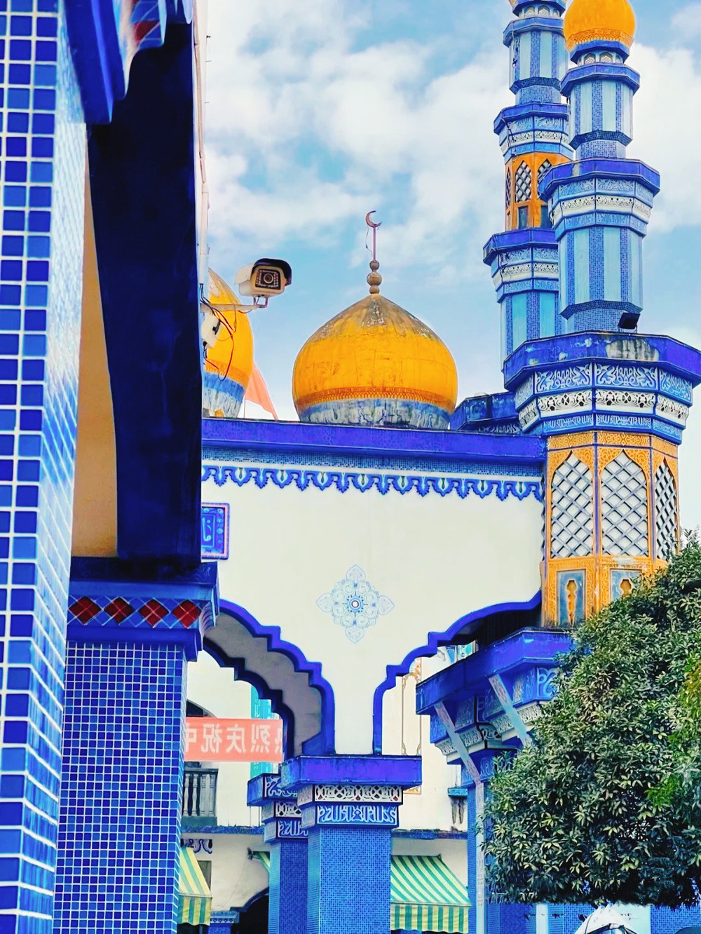大门和宣礼塔,绝美的蓝色,还有建筑上夹杂着西洋风情的纹样,也有中式的味道,穿搭长裙、白衣、披巾,拍出的照片超高级,但是注意!不能穿短裤背心哦~