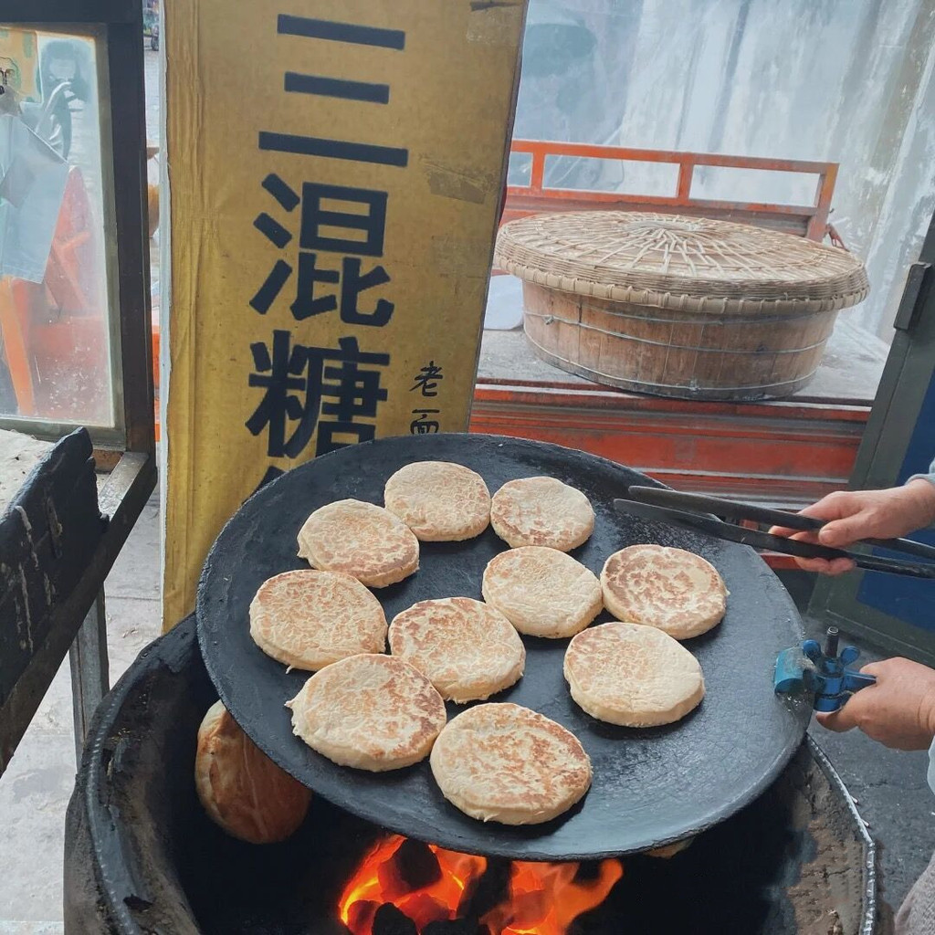除了清真美食,很出名的就是已经开了40年的老字号混糖锅盔,锅盔外壳酥脆,里面是红糖流心,一点也不腻,现在混糖锅盔的口味也更多样了,菜的、肉的、糖的都有!