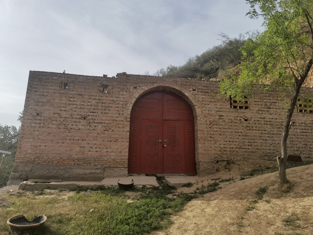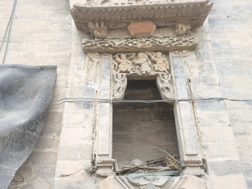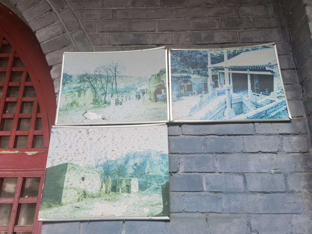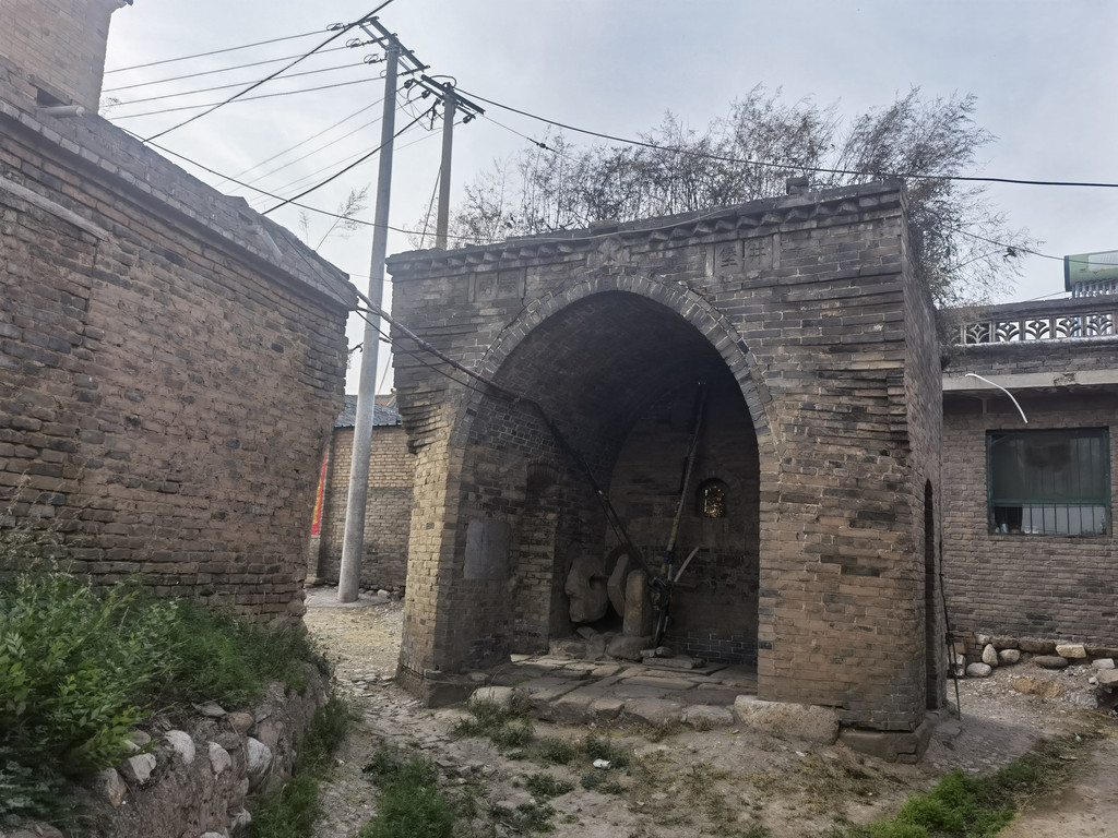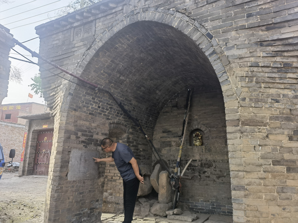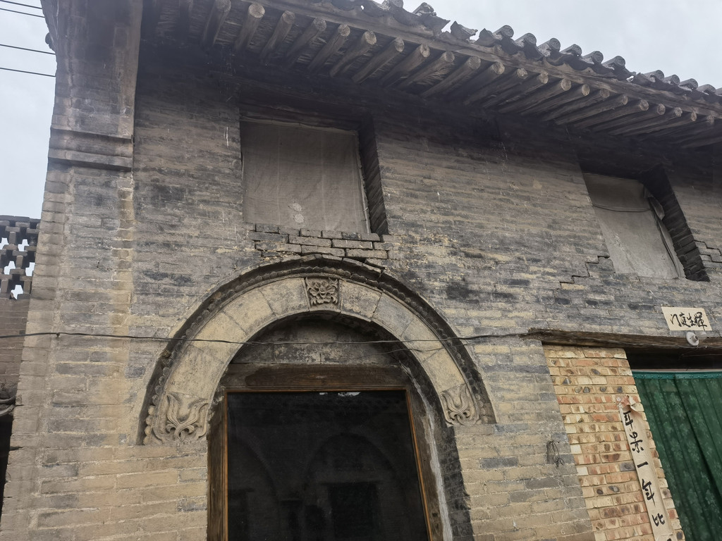 村里的老建筑群正在损坏,有些已经坍塌,刘先生带我们一处一处地参观。蔺家以前居住的地方叫明珠堡,有东、西两座城堡门,目前西门已经拆除,只留下了一座东堡门。在堡内存留了一座二层楼窑洞,门头上有木刻“覩时兴怀”的匾额,是1932年修建的,主人是蔺家的人,房上还有修建的日期和当时相关的人名,刘先生带我们楼上楼下室内室外进行了参观,在窑洞里的墙体中隐藏有暗室,很明显是以前的“保险箱”,用来藏钱财的,主人刘老先生还让我们看了墙体的可疑之处,认为这些地方的砖缝很奇怪,也许是暗室的门,也许是为了迷惑别人故意修的,主人并没有太在意这些也就没有刻意去破坏墙体。