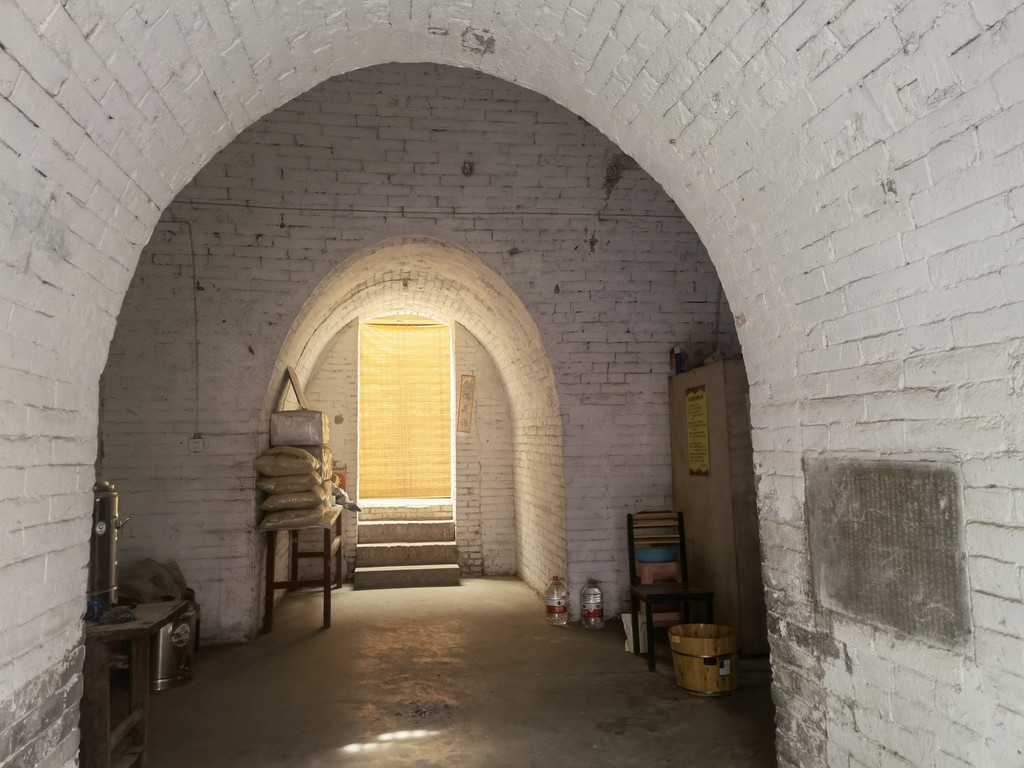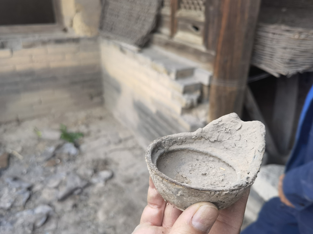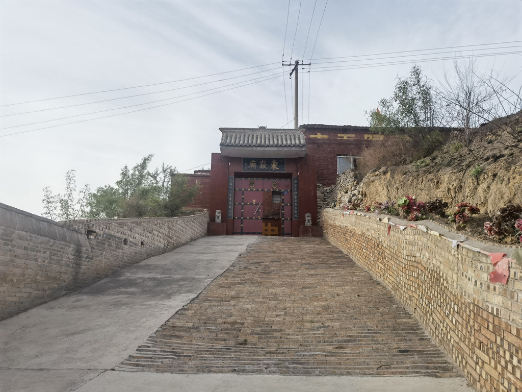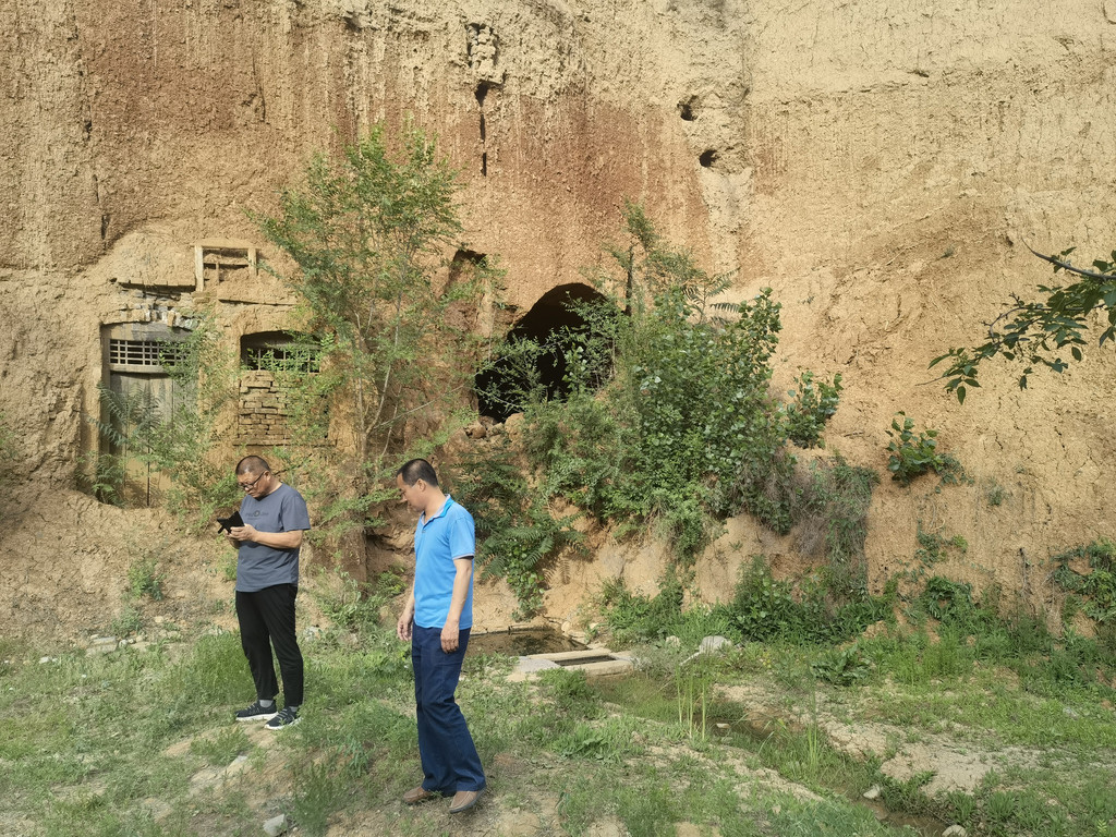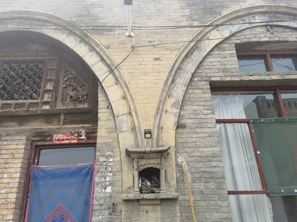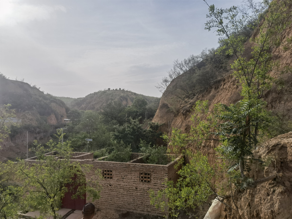 村里的老建筑群正在损坏,有些已经坍塌,刘先生带我们一处一处地参观。蔺家以前居住的地方叫明珠堡,有东、西两座城堡门,目前西门已经拆除,只留下了一座东堡门。在堡内存留了一座二层楼窑洞,门头上有木刻“覩时兴怀”的匾额,是1932年修建的,主人是蔺家的人,房上还有修建的日期和当时相关的人名,刘先生带我们楼上楼下室内室外进行了参观,在窑洞里的墙体中隐藏有暗室,很明显是以前的“保险箱”,用来藏钱财的,主人刘老先生还让我们看了墙体的可疑之处,认为这些地方的砖缝很奇怪,也许是暗室的门,也许是为了迷惑别人故意修的,主人并没有太在意这些也就没有刻意去破坏墙体。