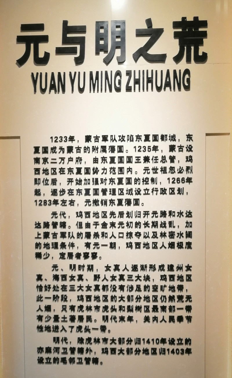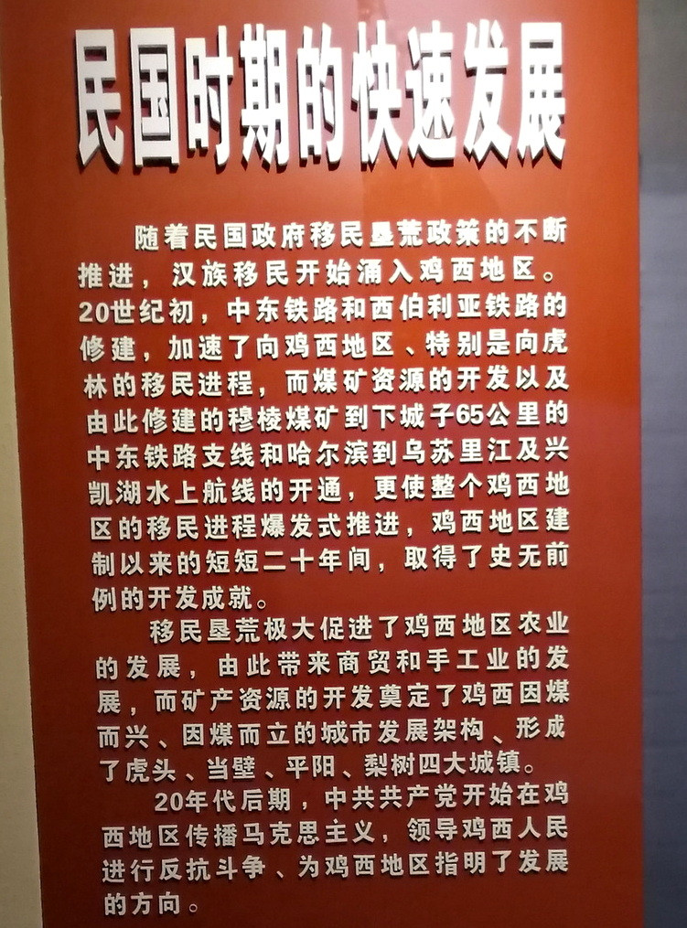 8-28早早起床去看穆林河,让我见识了我国最长的本地历史雕塑群,可赶回来时6:50的火车票没了,只好买了下午1点半的车,正好,利用上午时间去参观了鸡西博物馆。
