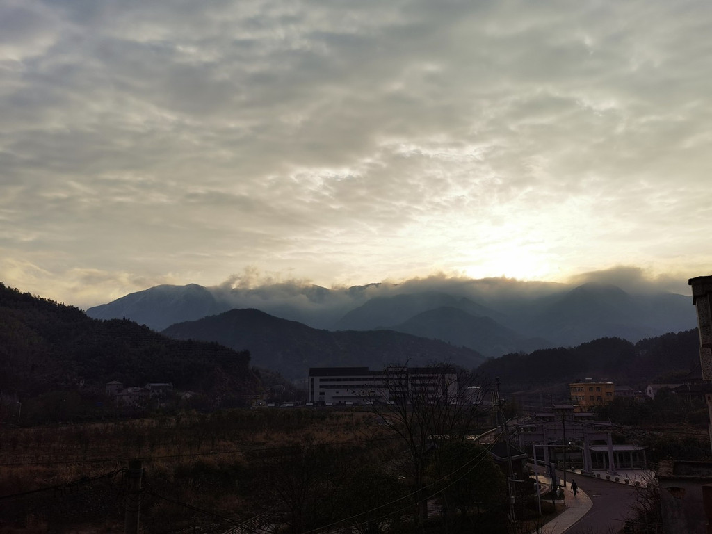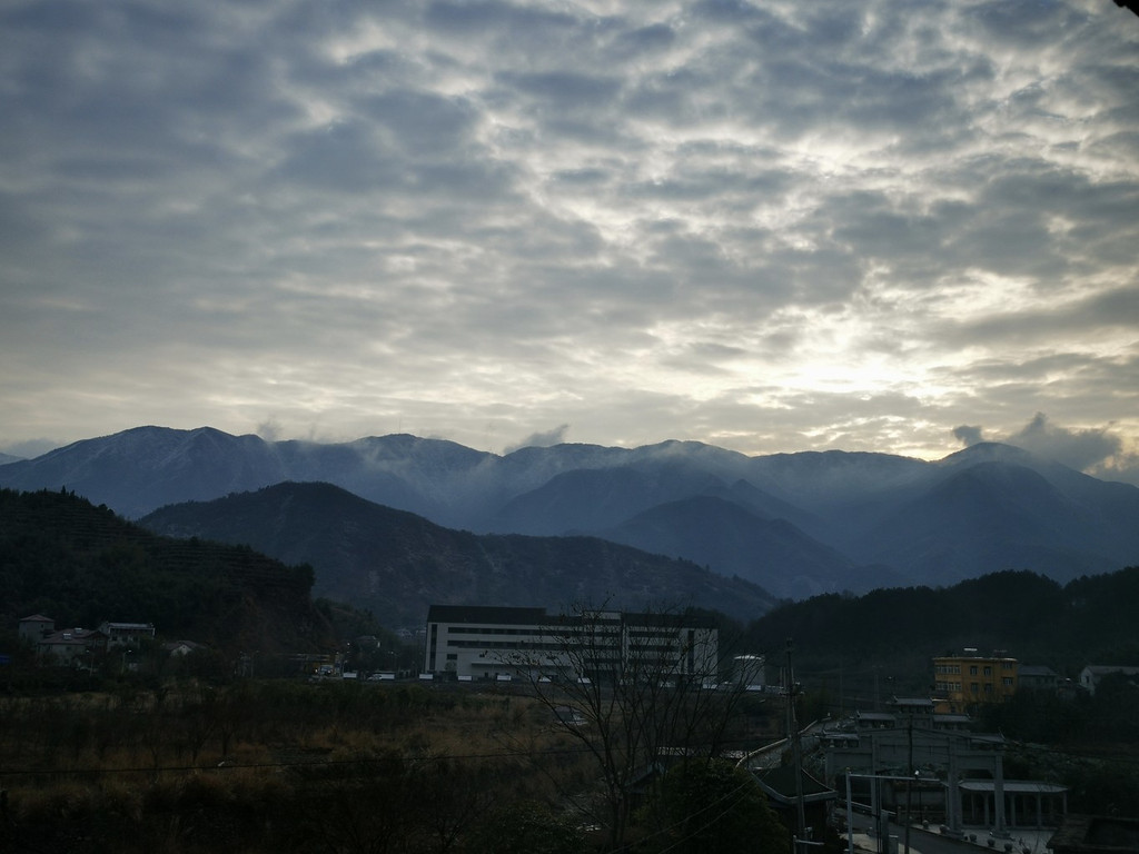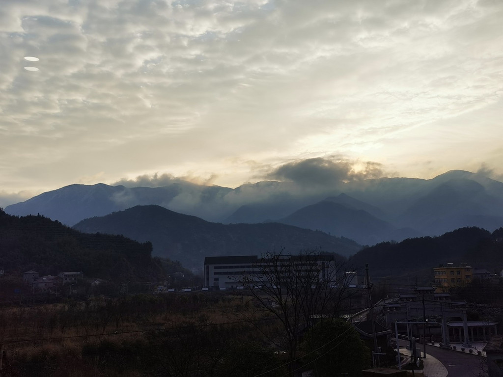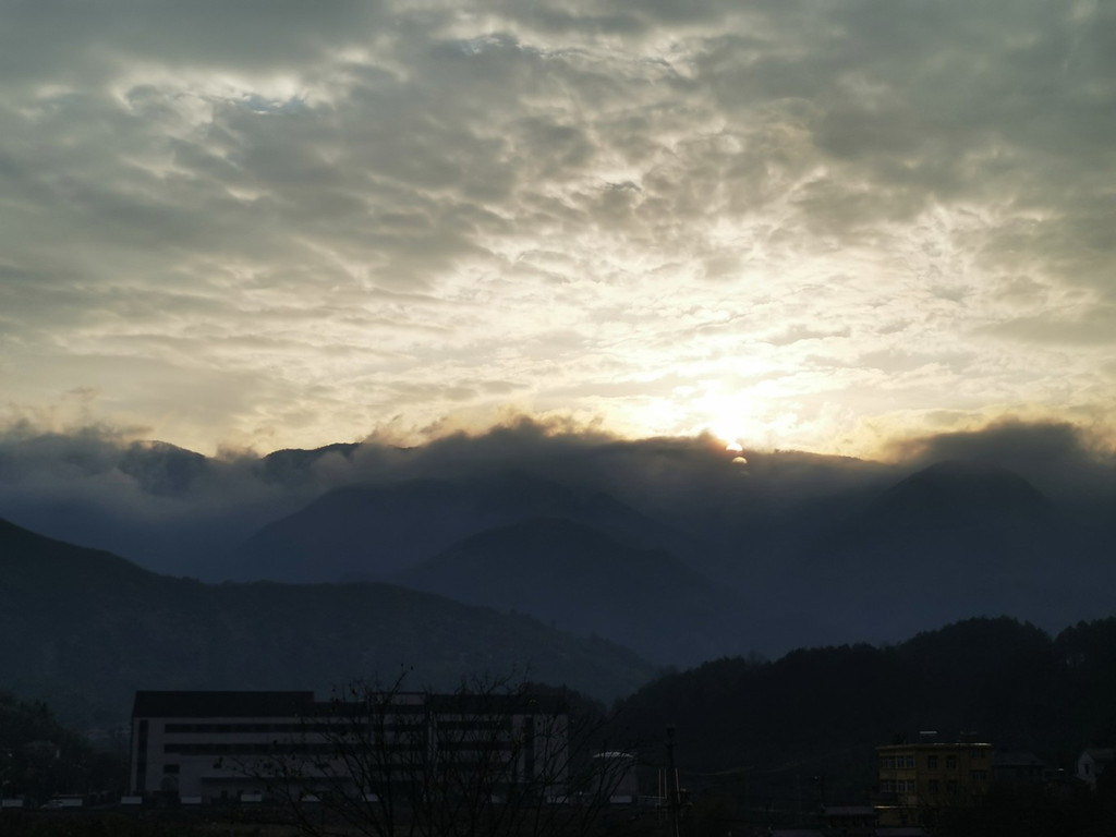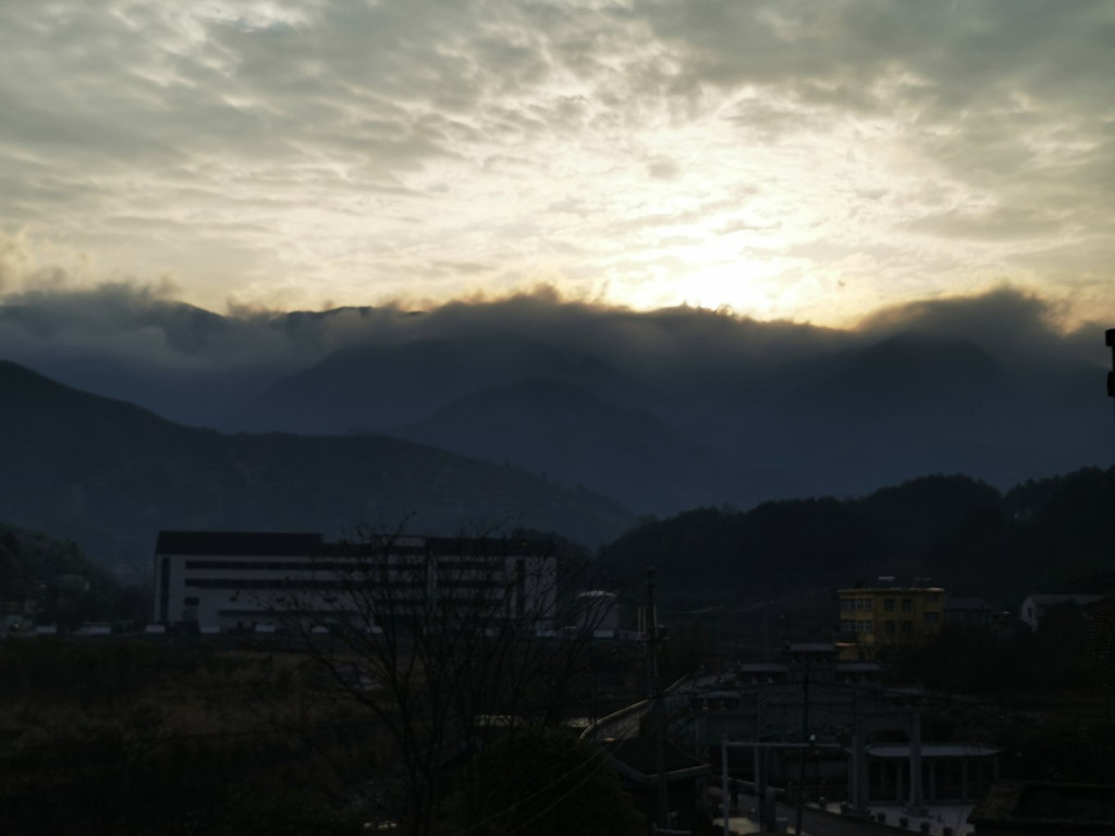 冬日的早晨气温很低,但是却有了晴天,于是就正在窗口抬头向窗口望去,惊喜地发现七点多钟还能见到龙王山日出,