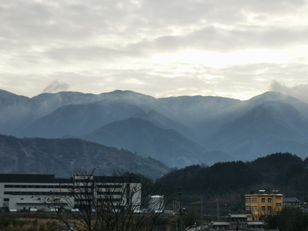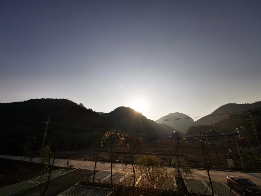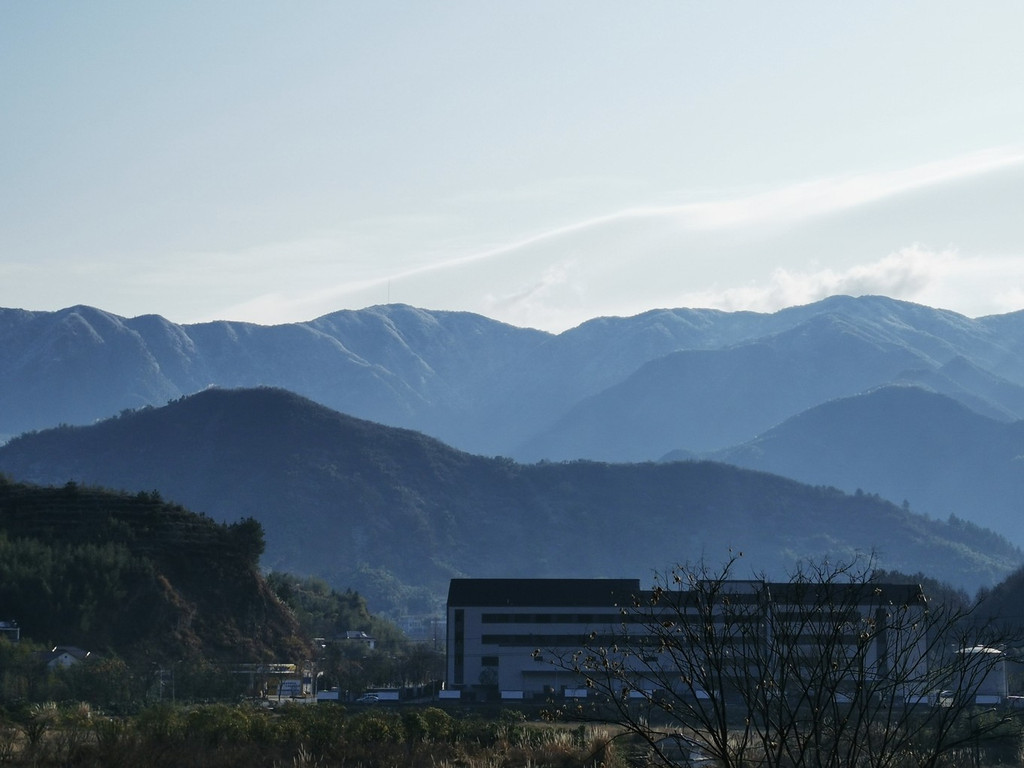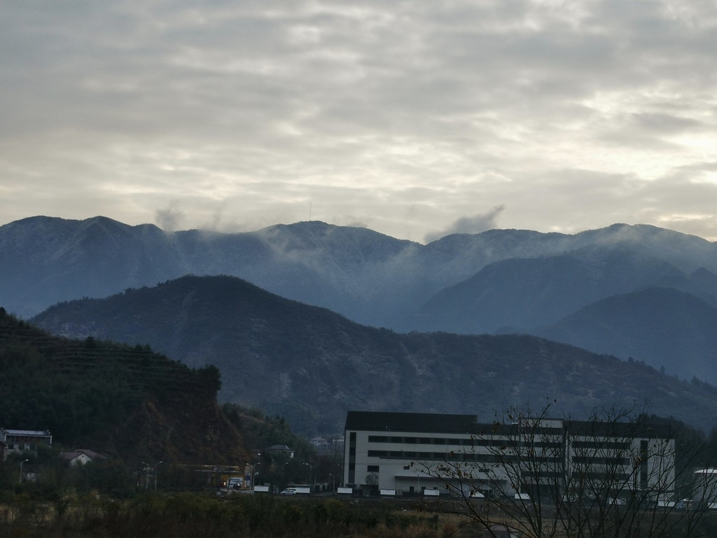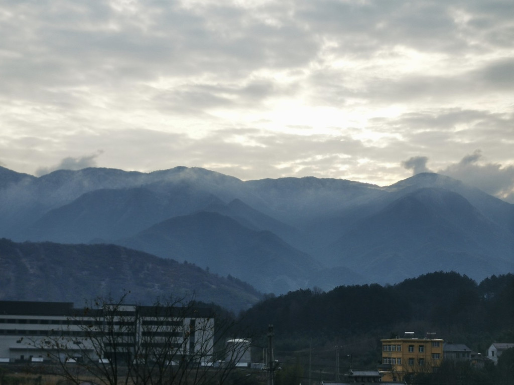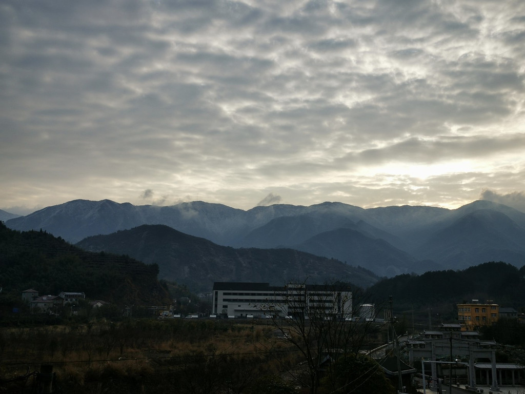 冬日的早晨气温很低,但是却有了晴天,于是就正在窗口抬头向窗口望去,惊喜地发现七点多钟还能见到龙王山日出,