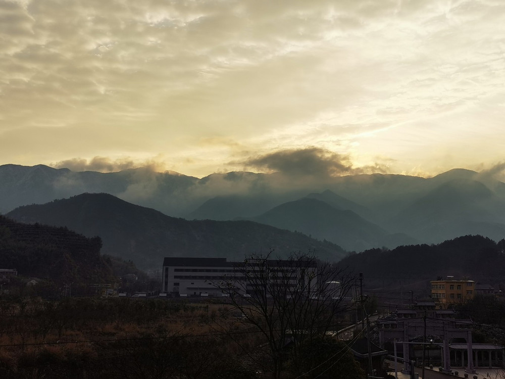 “春暖花开民宿”位于章村镇,靠山沿着河,可以眺望龙王山脉,早上还可以看到山上的日出云海的龙王山,