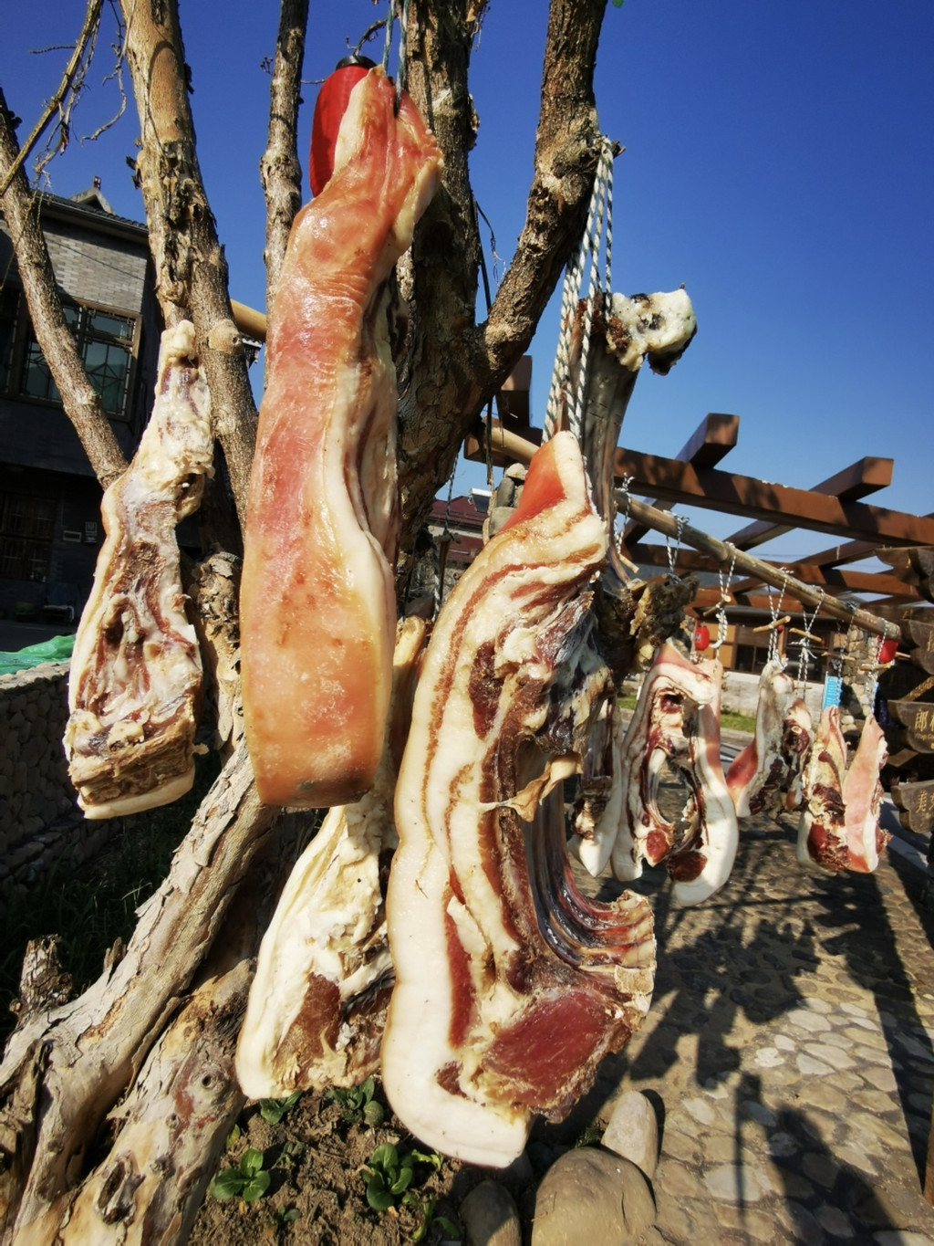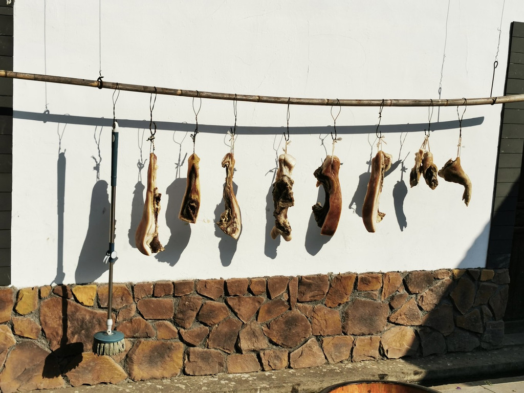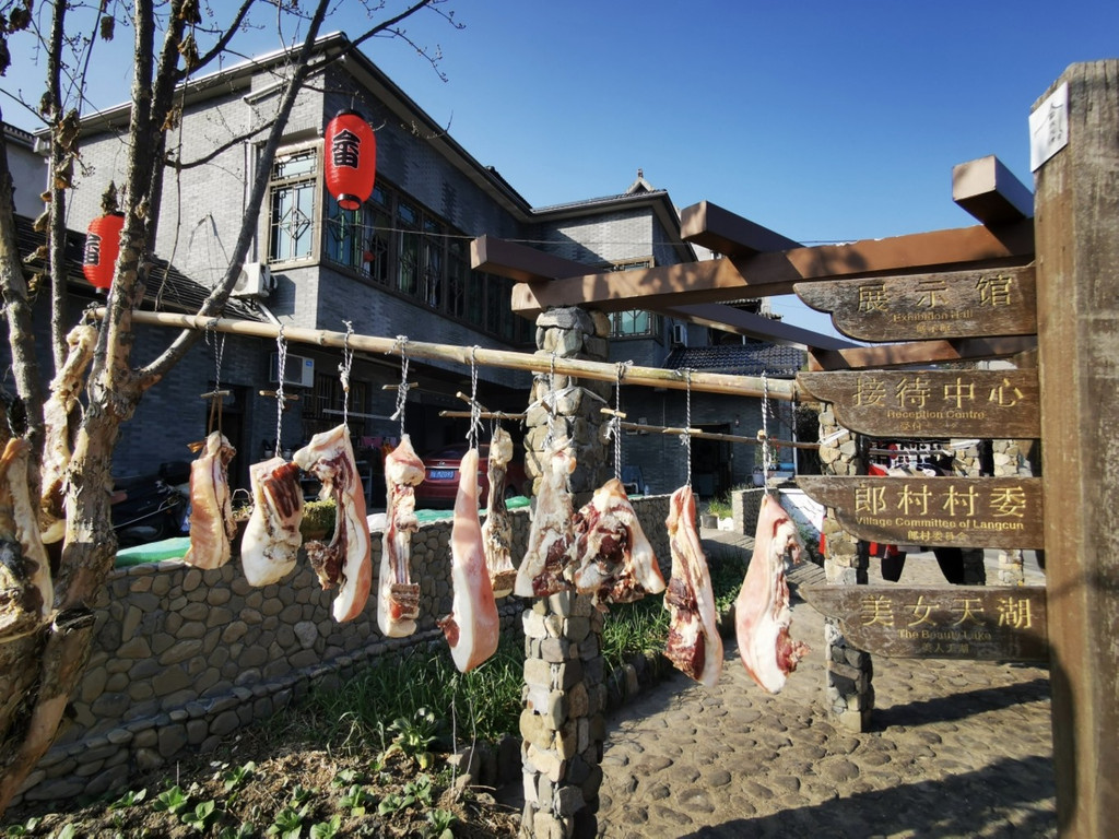 家家户户小楼,感觉都蛮 富裕 的,屋檐下晾晒着咸肉不少,
