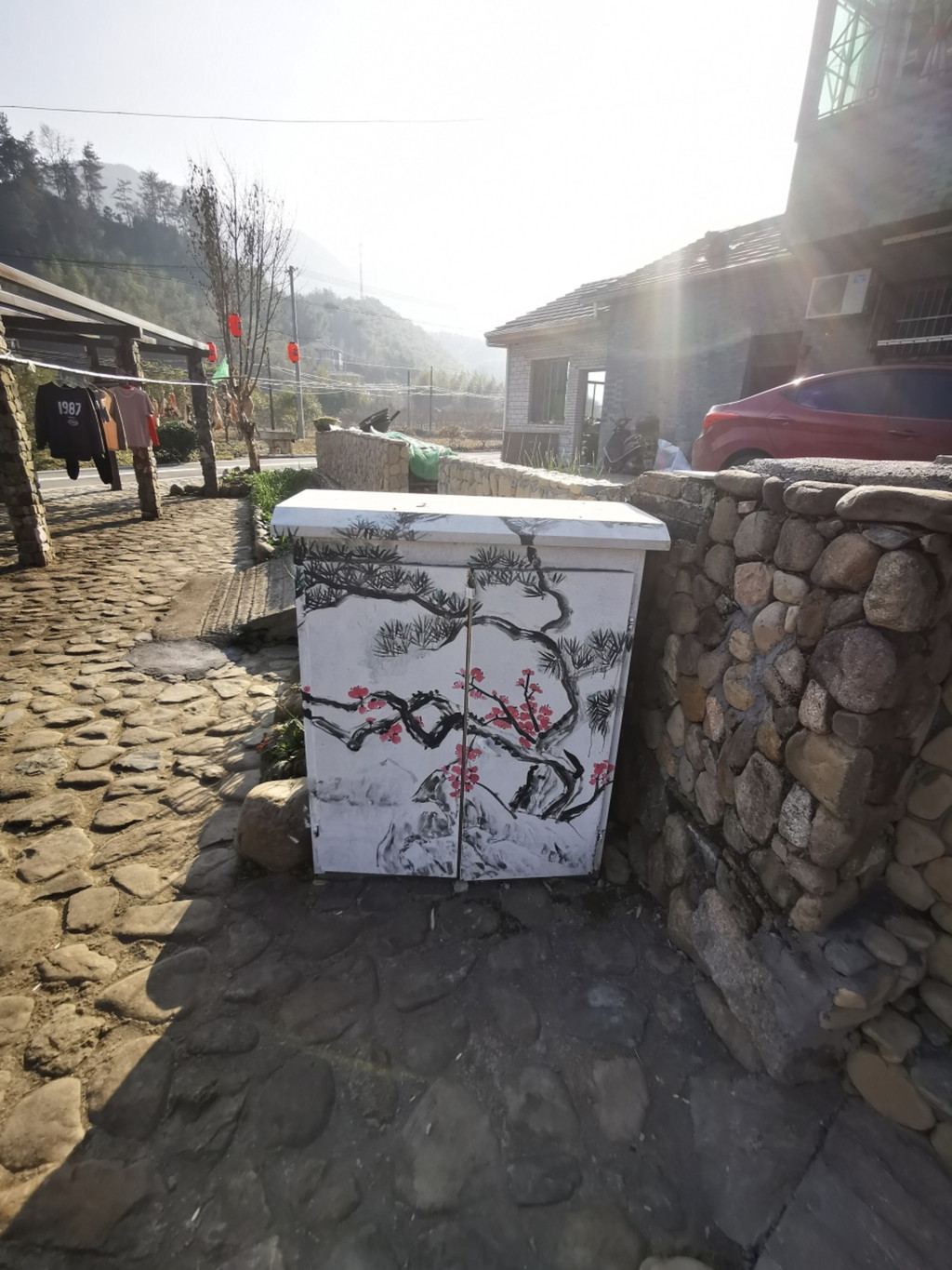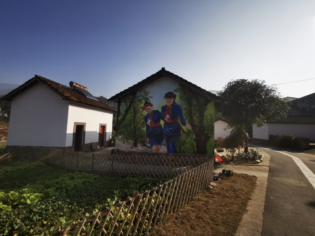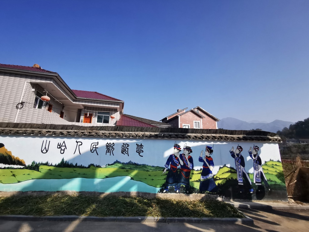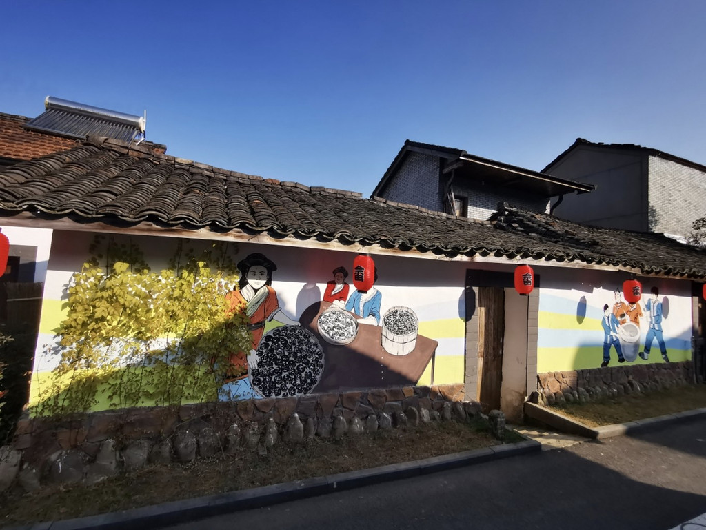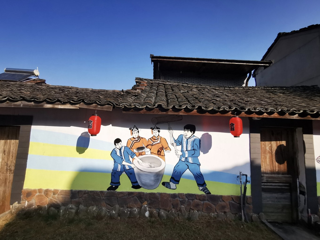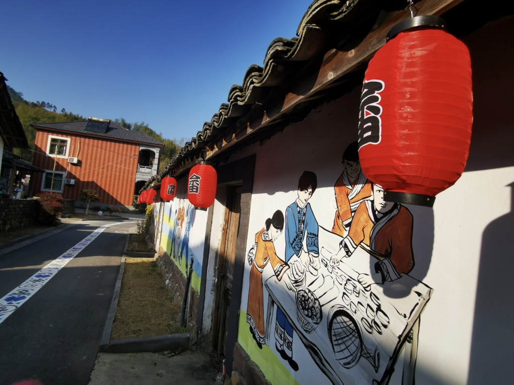 墙面上也有墙绘,绘画一些畲族的劳作、风俗都场面,红色的灯笼上也有畲字样。
