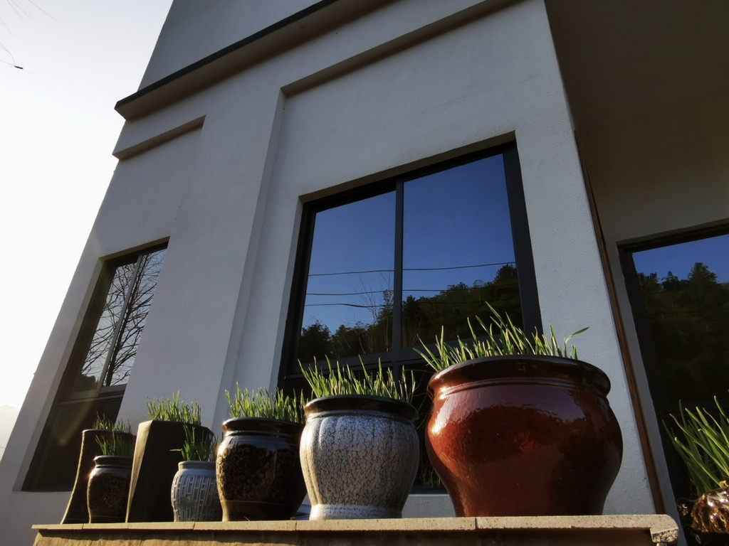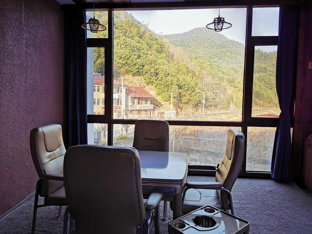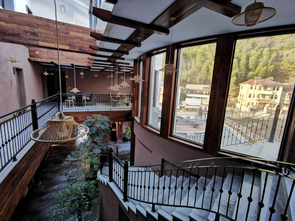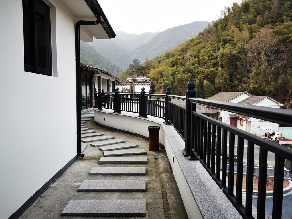 三楼更为幽静而惬意,有石子铺设的小径可以来到房间门口,门口还有露天的小庭院,在门口布置着休闲座椅,可以喝下午茶,眺望远方的群山叠嶂。