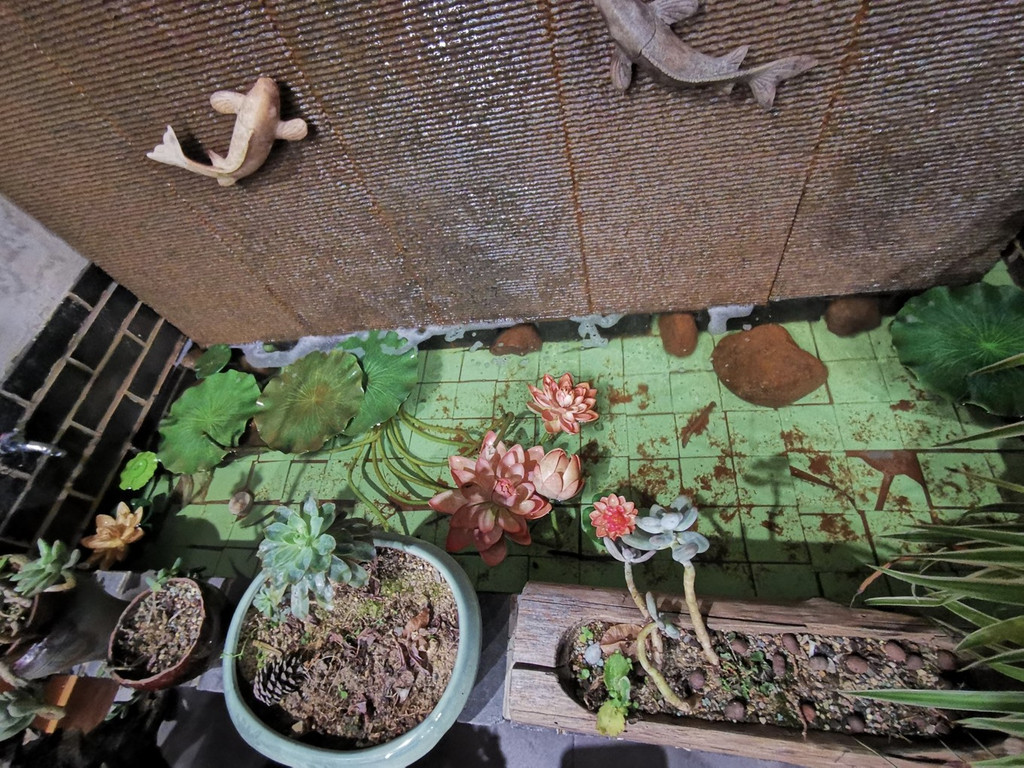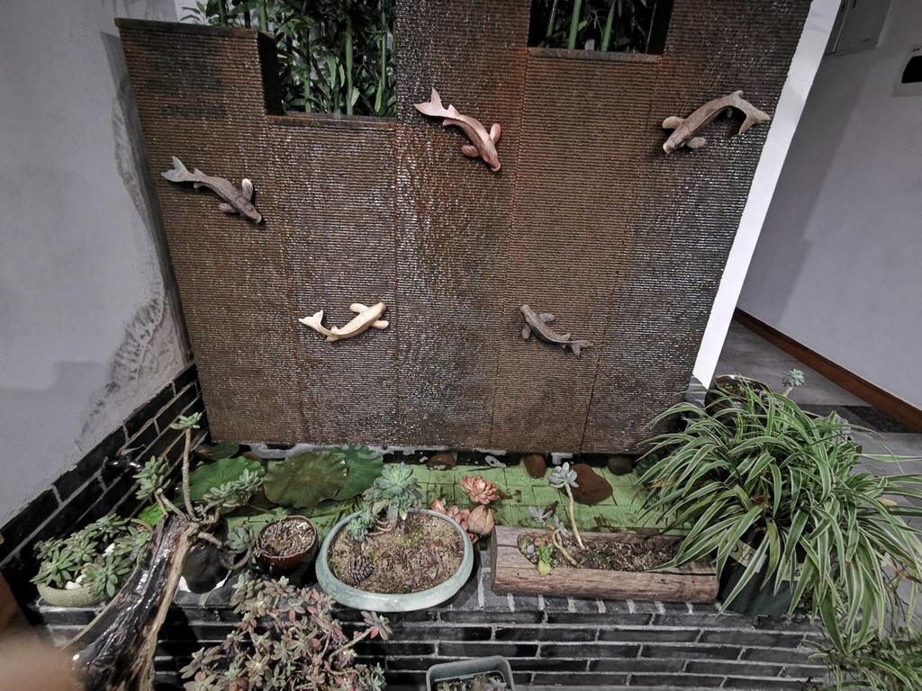 1楼大厅布置的也非常的清新,有一个宽敞的原木大桌,桌上点缀着白色的花朵,边上有一个小型的流水和有荷花、有鱼儿的雕塑。