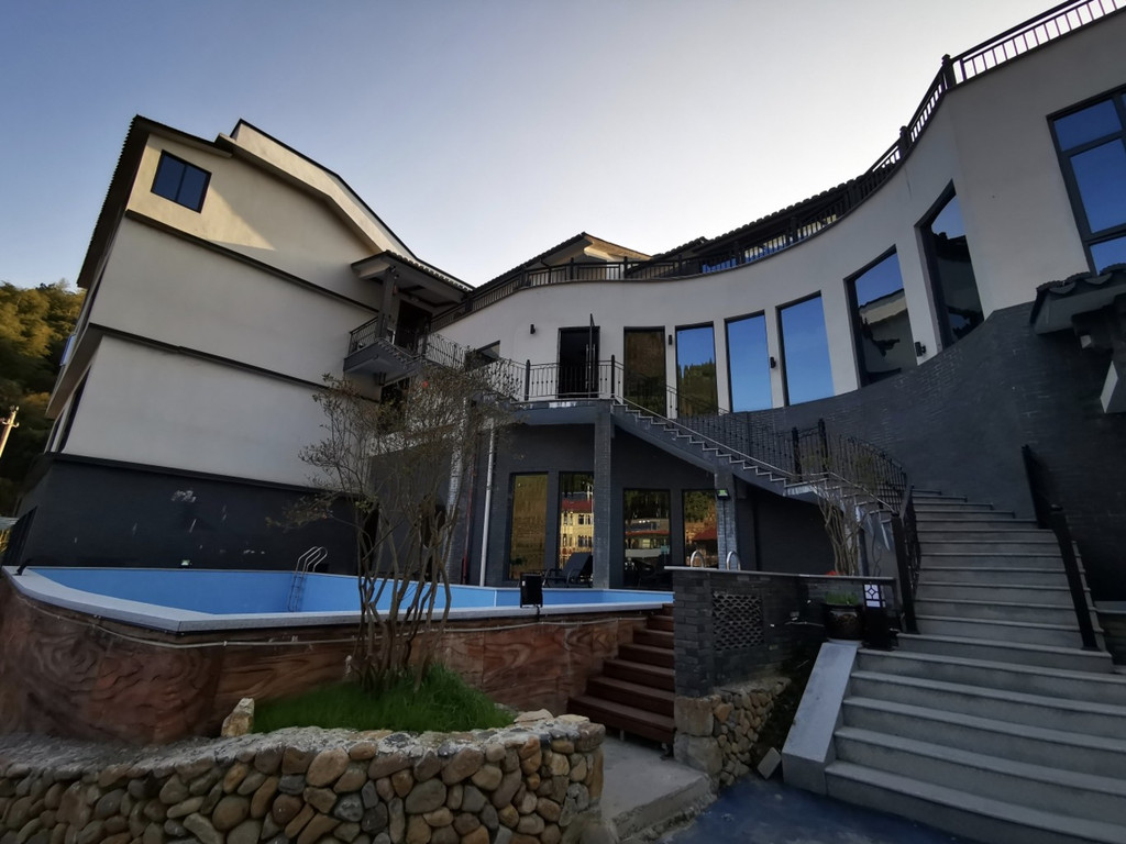 室外露天空间布置雅致庭院深深深几许,有一个石头凉亭,一楼与二层之间有一个面积蛮大的游泳池,夏天带孩子来避暑真是不错。