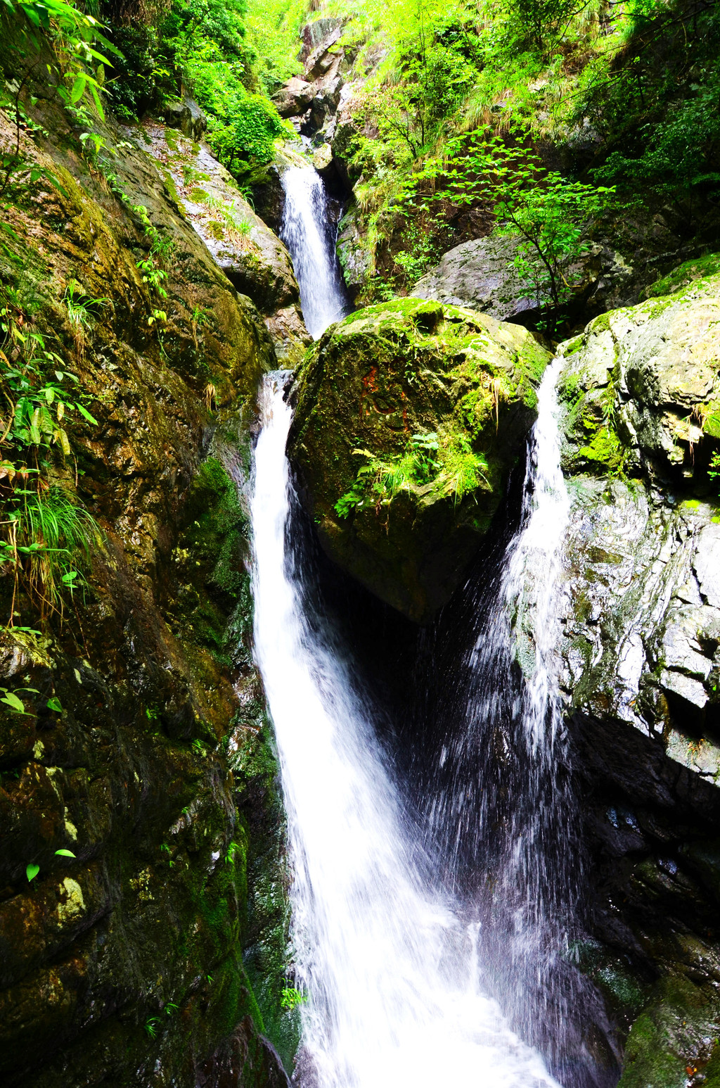 景区水量充沛,瀑布众多,上图是三线瀑,银花飞散,水珠溅玉,水雾弥漫。