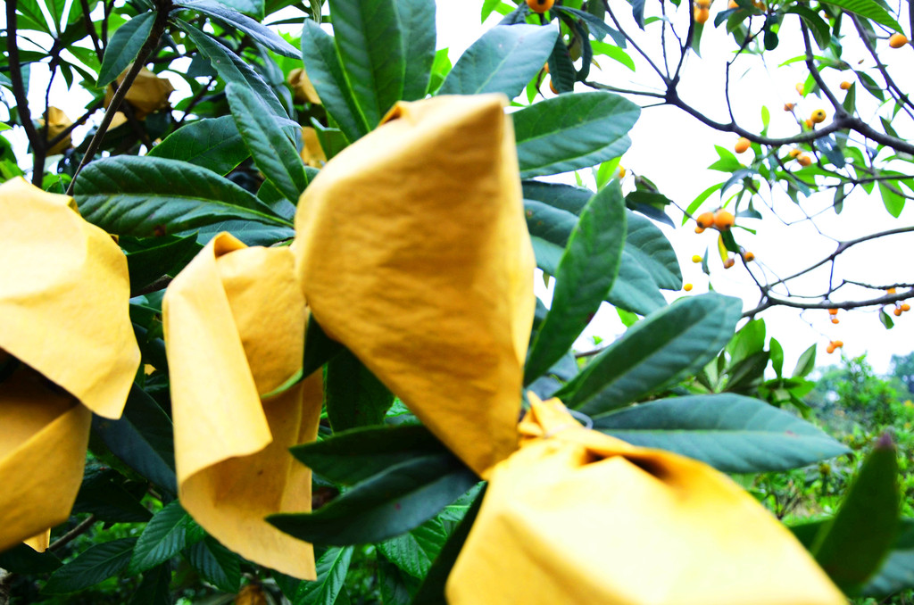 奇怪的是很多枇杷树上看不到枇杷,树枝上而是套着一只只浅黄色的纸袋,这是黑科技啊,套了这个进口防菌纸袋,太阳晒了也不会裂果,使白枇杷色泽光鲜,还不怕鸟儿啄。