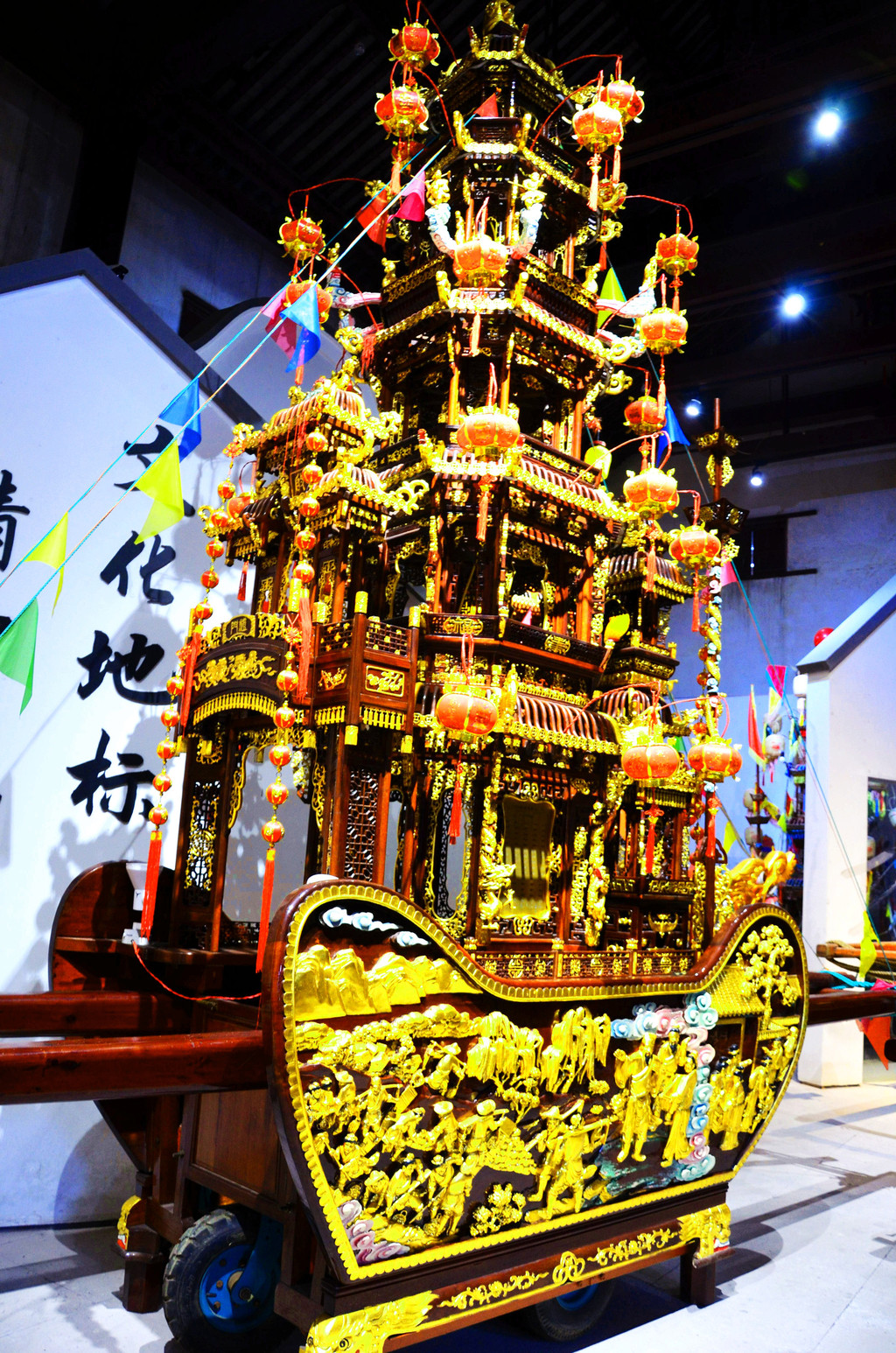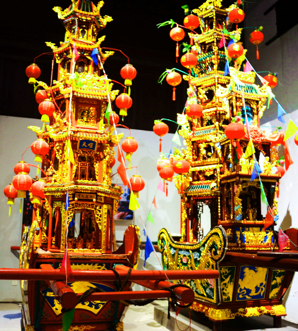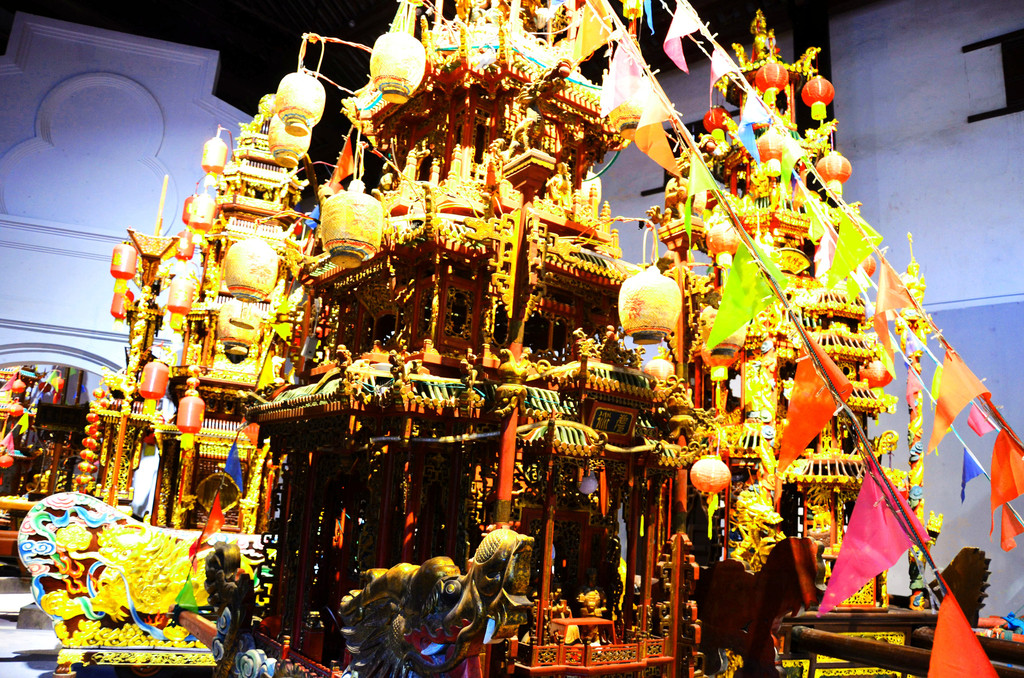 鼓亭馆内展示着元宵行会巡游时用的鼓亭、抬阁、秋千等,大多为明清时期的原物,每个物件都集雕刻、堆塑、绘画、贴金、泥金、罩漆等工艺于一身。