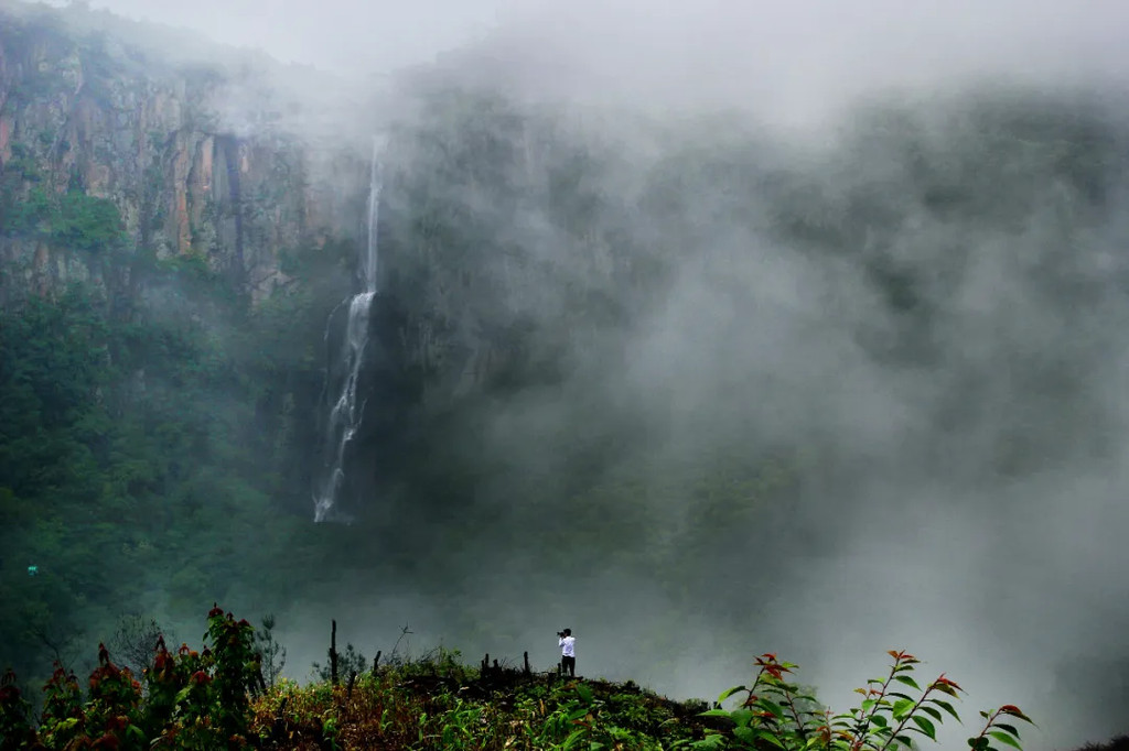 阵阵微风吹过,把瀑布吹的如烟如雾,水花飘落在身上,好像下过蒙蒙细雨,在阳光下光彩夺目。