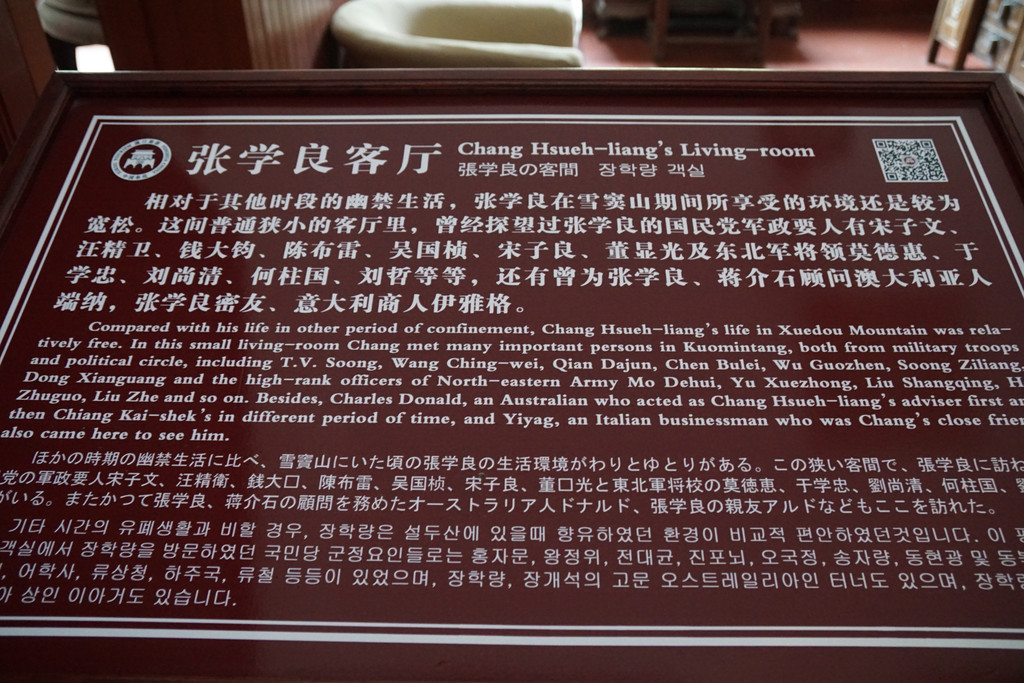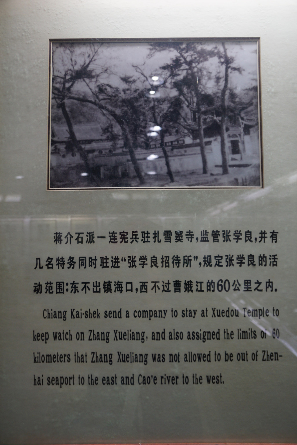 幽禁处位于雪窦寺旁。1937年11月,因厨房起火,中旅社招待所焚毁无遗,张将军同着宪兵们还在雪窦寺住过四五天。