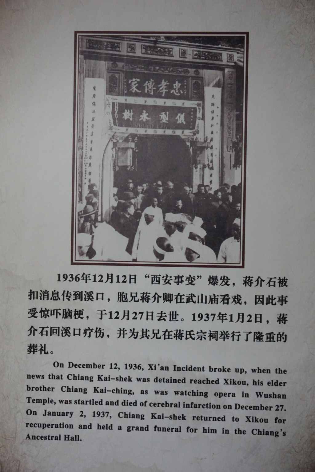 1936年12月26日,蒋介石被迫同意抗日与张学良达成和平协议后,由张学良亲自护送乘飞机返南京。一回到南京,蒋就将张学良扣押起来,交给军事法庭进行审判。1937年1月2日,蒋介石带着夫人宋美龄和侍从室第二处主任陈布雷回到了浙江奉化县溪口老家,一面疗养,一面在幕后处理西安善后事宜。1月13日,张学良在米春霖、贺耀组、戴笠的“陪同”下,由南京飞往宁波惟一的栎社机场,然后换乘汽车赴奉化溪口,蒋介石下令暂时将张学良安置在溪口镇上的别墅文昌阁内。