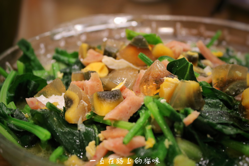 外婆三宝:鲜嫩的菠菜,搭配皮蛋、咸鸭蛋,用上汤的做法,十分爽口。