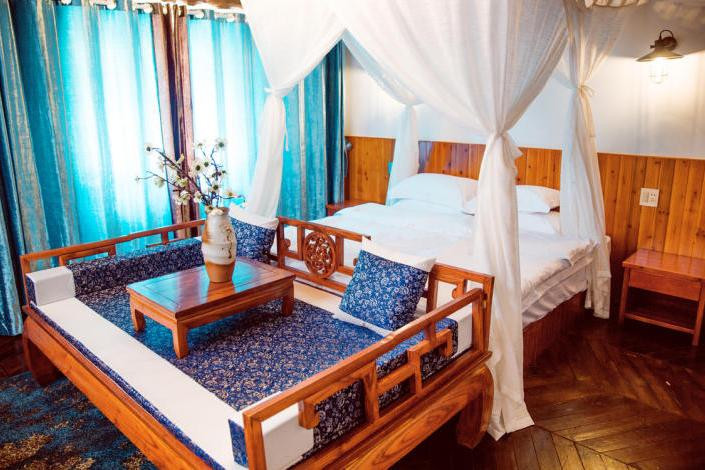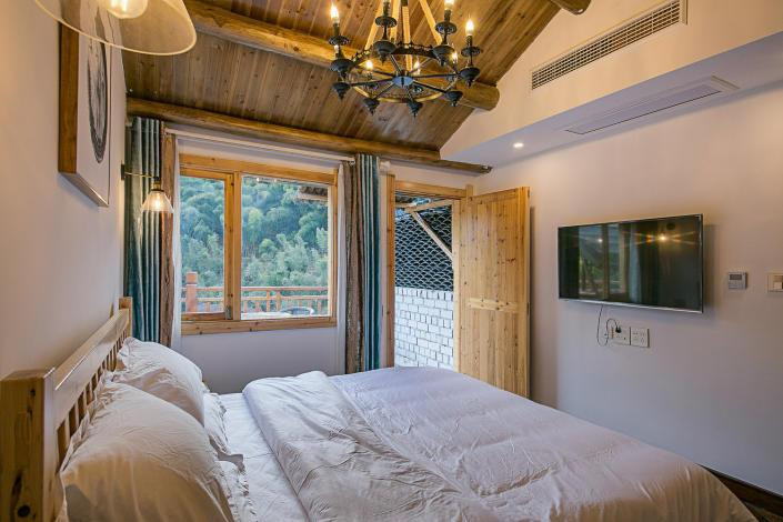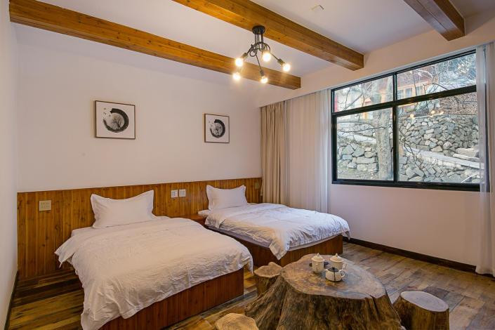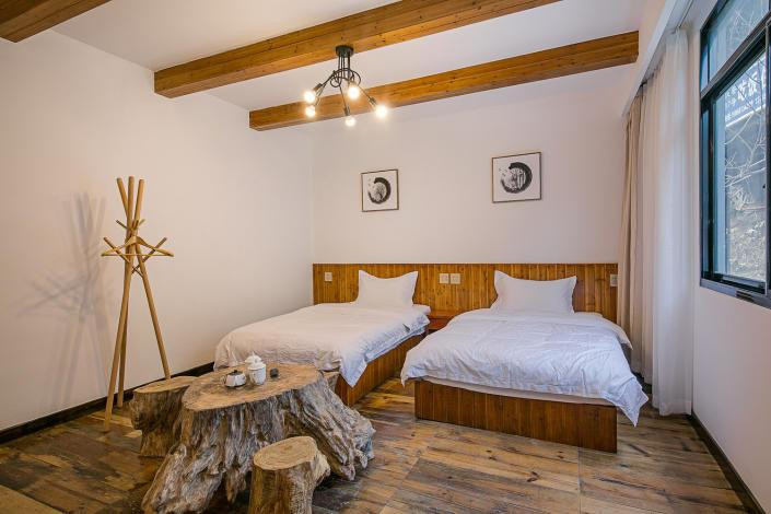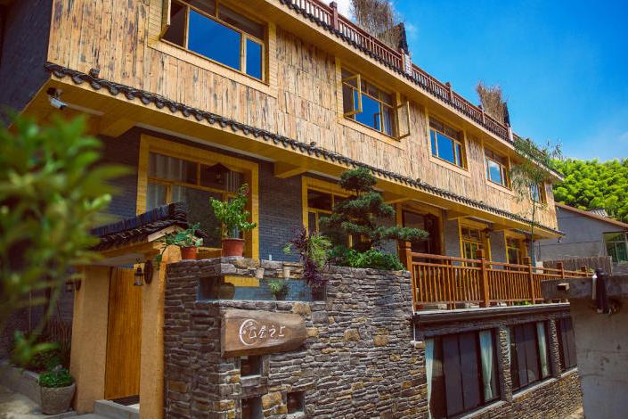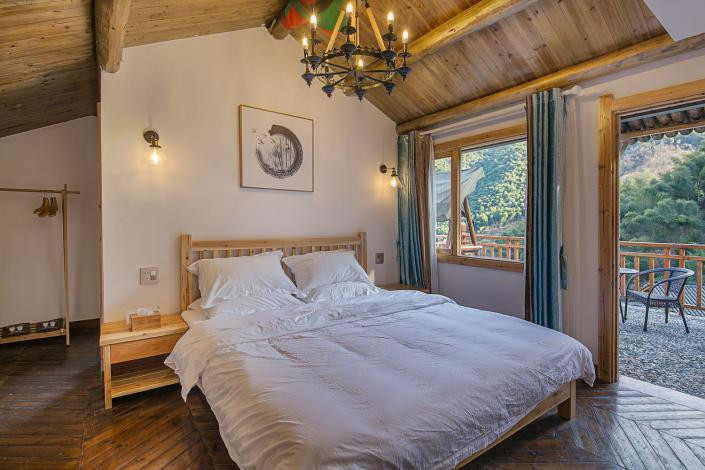 民宿占地面积广大,坐落在村子半坡位置,位置高耸,视野开阔,四层颇具本地乡村木建房屋,有着浓郁的古朴韵味。