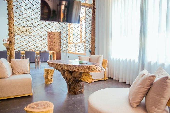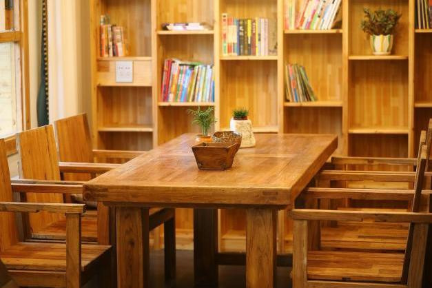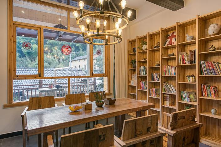 民宿内部配有独立的休闲区域,两侧书架放满书籍,中间原木桌椅散发着清新木香,在这里小坐上一会,看上一会书,时不时的望一望窗外风景,好不惬意。