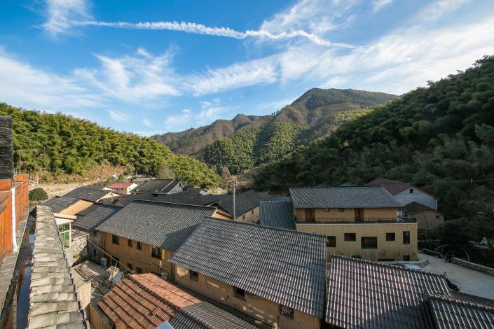 闲来无事时,可以到民宿楼顶的露天露台小坐一会,这里的观景位置极好,可以将四周的景色全部纳入眼内,青山掩映下的小村庄安静祥和,像是一只睡熟了的猫咪,柔和静谧。