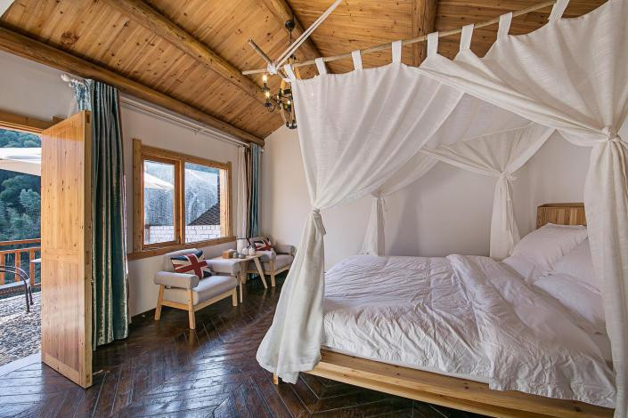 房内装饰中西结合,装饰造型别致轻奢,既有现代的舒适沙发、大床,也有复古床榻、帷帐和树墩桌凳,原生态与现代时尚进步的结合,和谐不冲突,丝毫没有违和感。