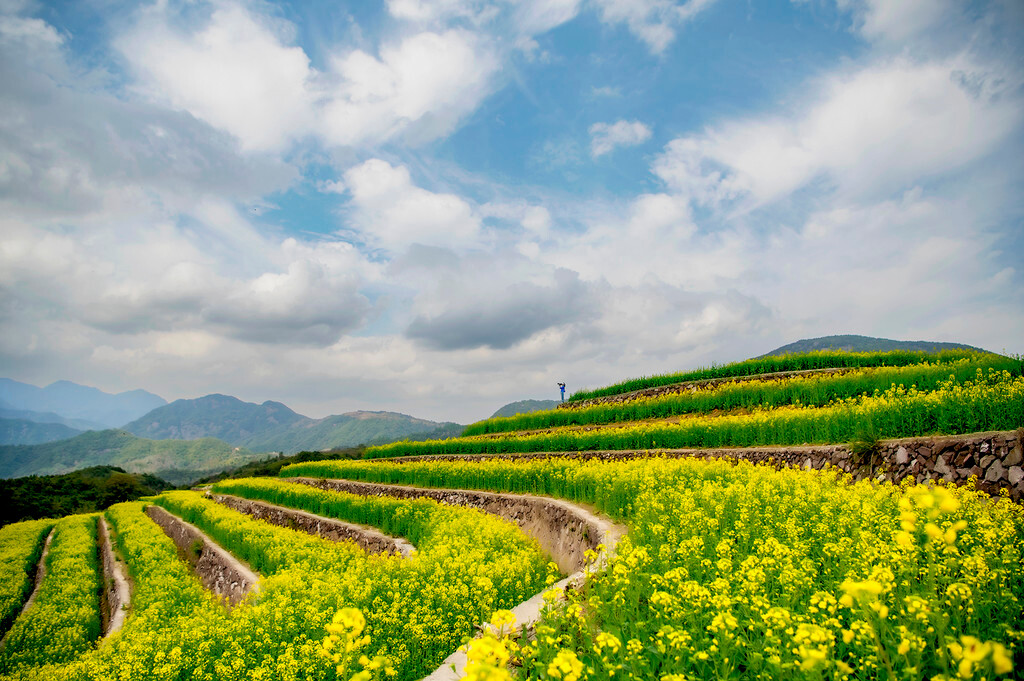 梯田状的油菜花一层层如链似带、层层叠叠,放眼望去,漫山遍野金灿灿的油菜花随春风摇曳,花香沁人心脾,陶醉了赏花的游客。从空中俯瞰,美景尽收眼底,惊艳无比的油菜花海与一座座白墙灰瓦的村落民居相映生辉,好一幅迷人的乡村画卷。