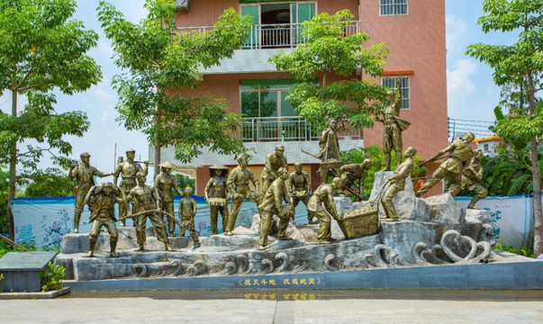 雕塑广场摆放着陈残云老先生的晚年形象石像。陈残云老先生自称麻涌水乡是他的第二故乡,麻涌的田园河涌里,到处都留有他的足迹。广场里还建造了“战天斗地 改造蛇窝”雕像群,十分生动。