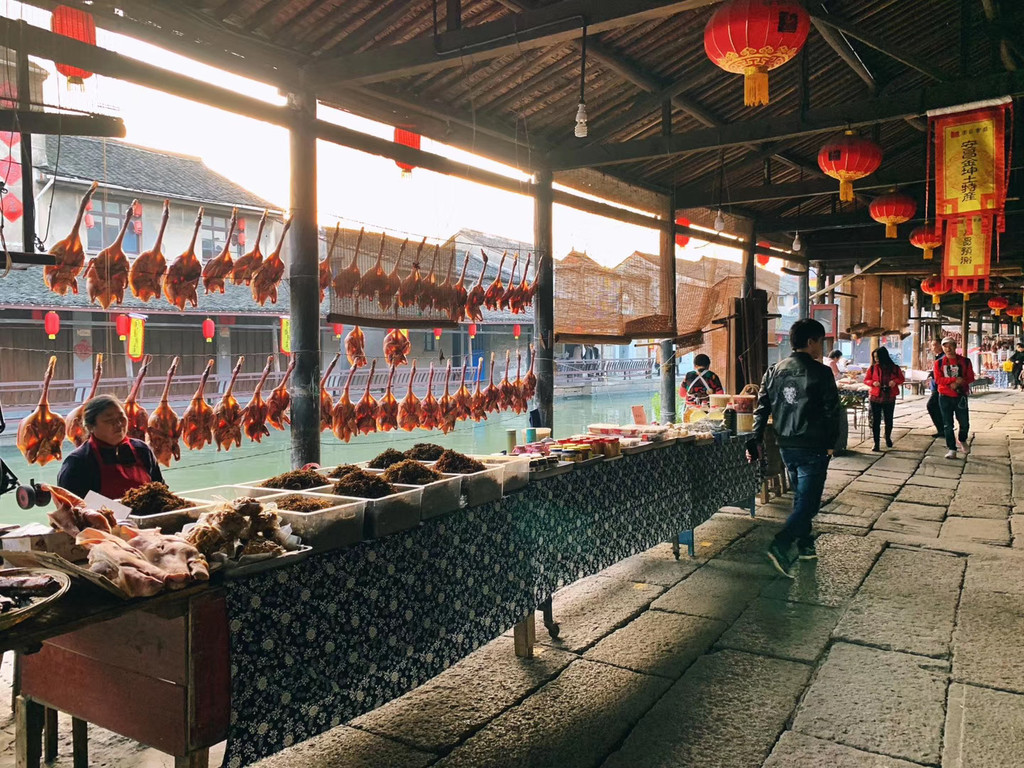 安昌古镇是绍兴最原汁原味的古镇,它的原汁原味不指的是北岸的商市,南岸的民居,而是安昌的腊肠和仁昌的酱油。来到古镇,很多小伙伴会发现这里家家户户门前挂着都是酱鸭和腊肠,就连空气里都弥漫着酱香。在《舌尖上的中国》中播出后更是火遍全国。