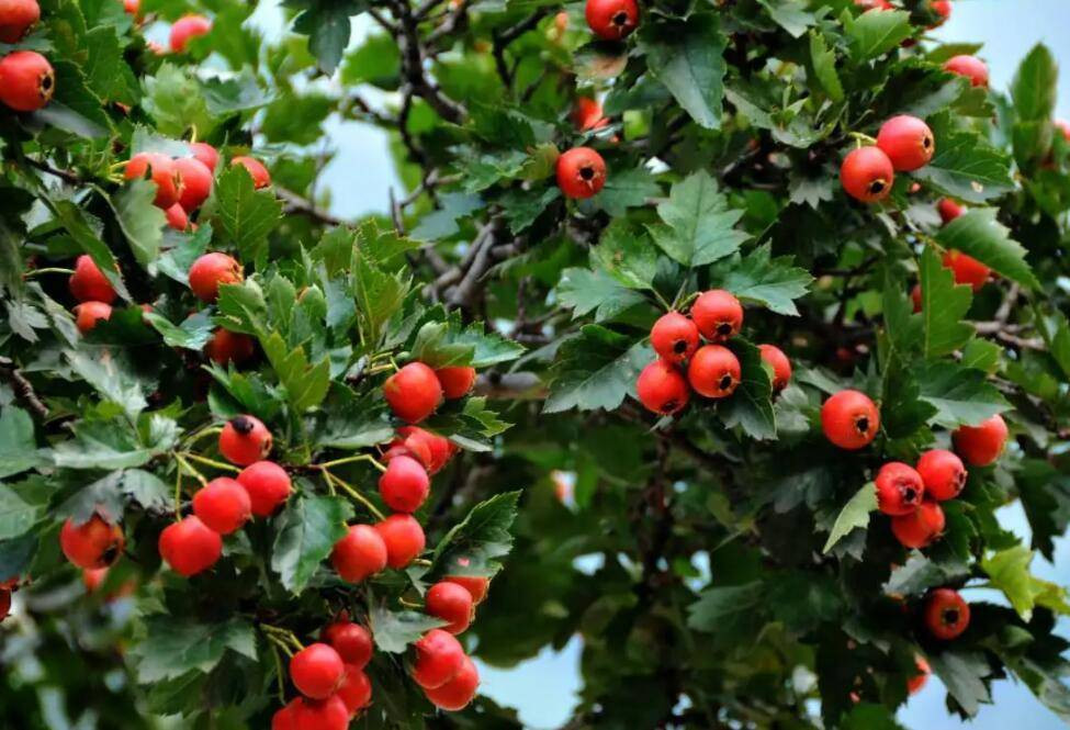 新鲜的山楂果实的营养价值非常丰富。偶尔吃两点,解馋又爽口!红红的果实挂满了枝头,一串串、一簇簇,把枝头点缀得鲜艳、热闹,红彤彤的山楂。