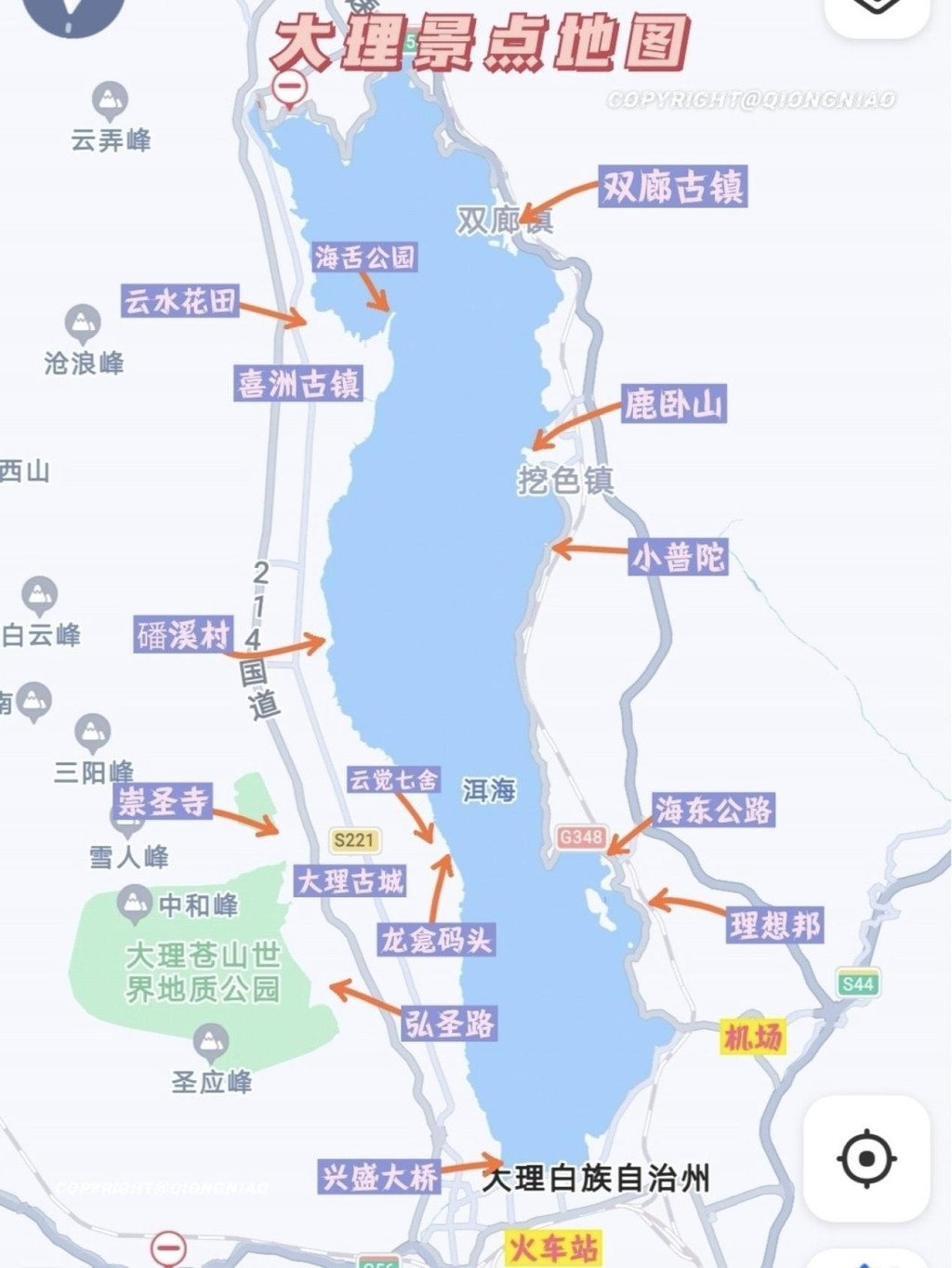整个大理其实是一个长方形,景点也几乎都是围绕着洱海存在的。比如说非常知名的挖色镇,双廊古镇,喜洲古镇之类的,都在洱海环线上。从网上找了一个地图供大家参考。因为时间有限,我们也只能在其中做一些取舍。