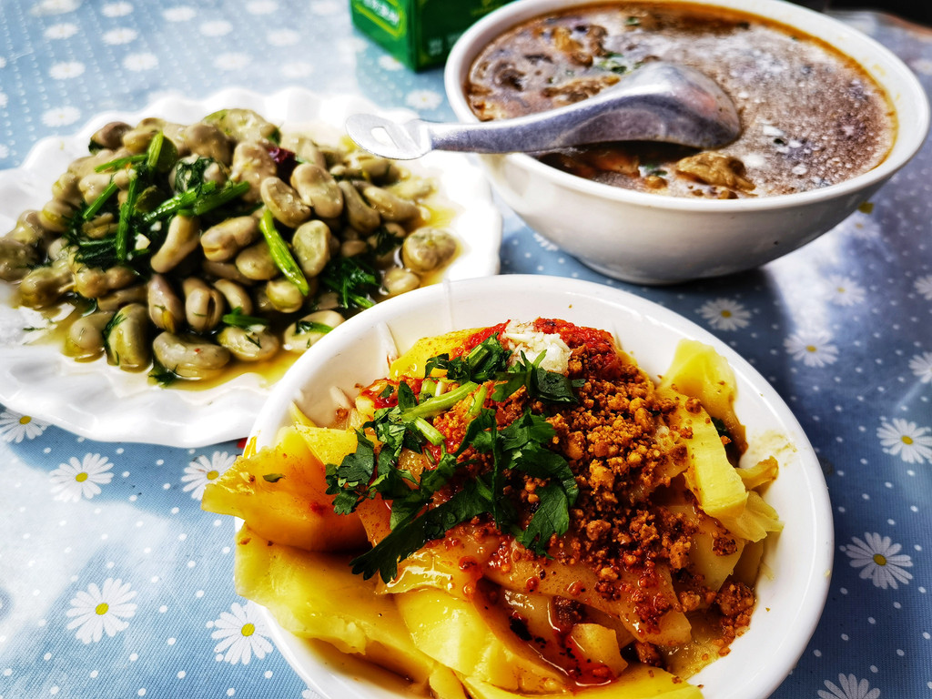 接近午饭时间,原计划去品尝白族特色美食生皮,后因担心岳母年岁较大,肠胃估计受不了,最终放弃品尝。点了三个她爱吃的菜,三碗米饭下肚,67元钱搞定午餐。