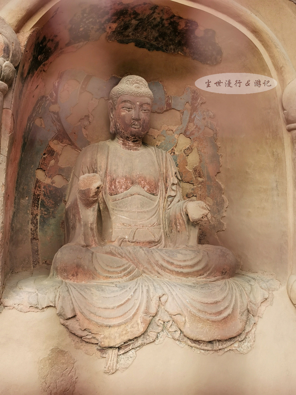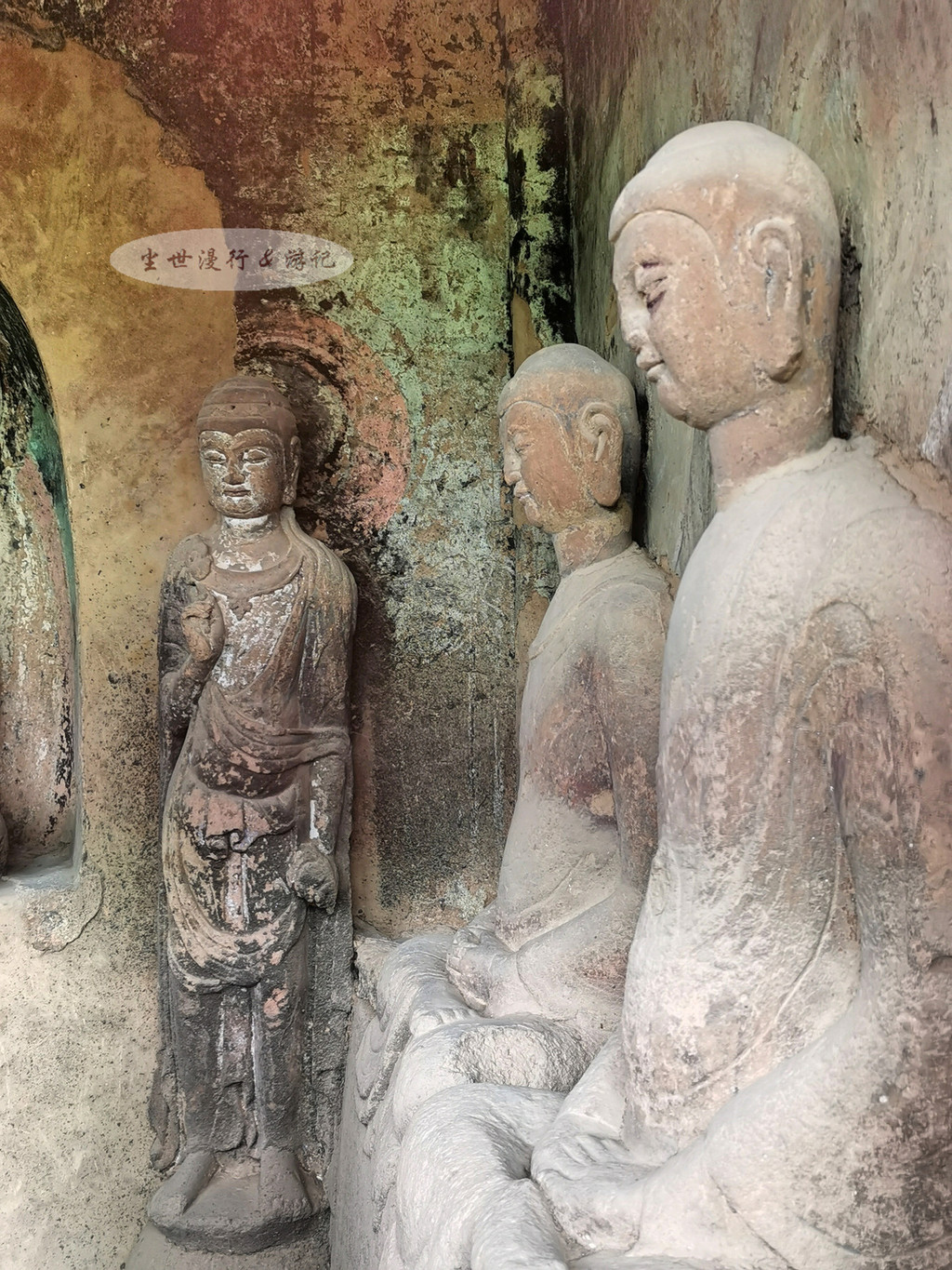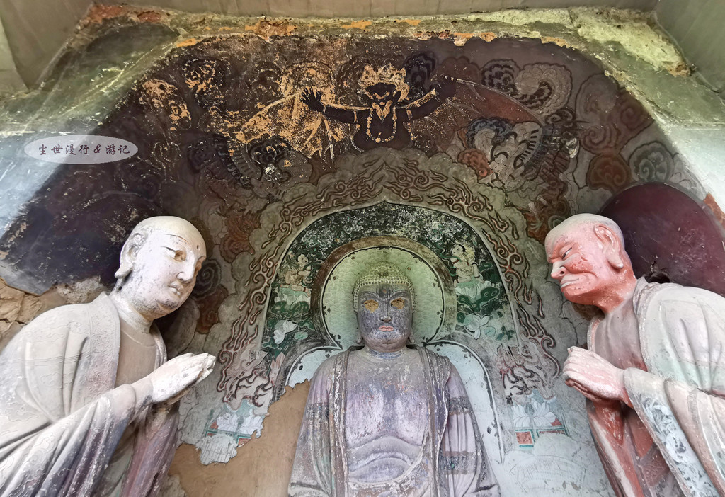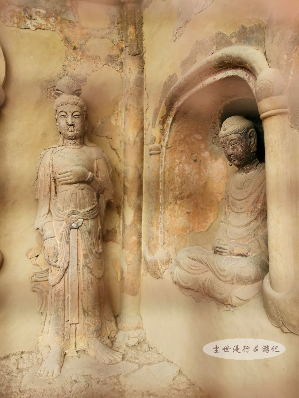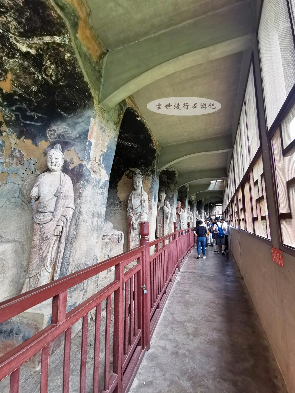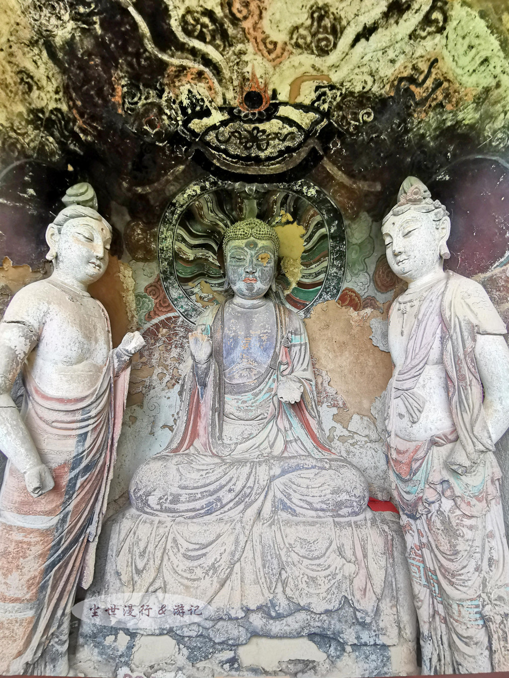 从第9窟出来向上攀爬就可见第3窟——千佛廊,开凿于北周,原有上、下六排佛像,故称“千佛廊”。千佛廊长32米,现崖壁上分两层整齐地排列着258尊石胎泥塑的神像,神情各异,栩栩如生。