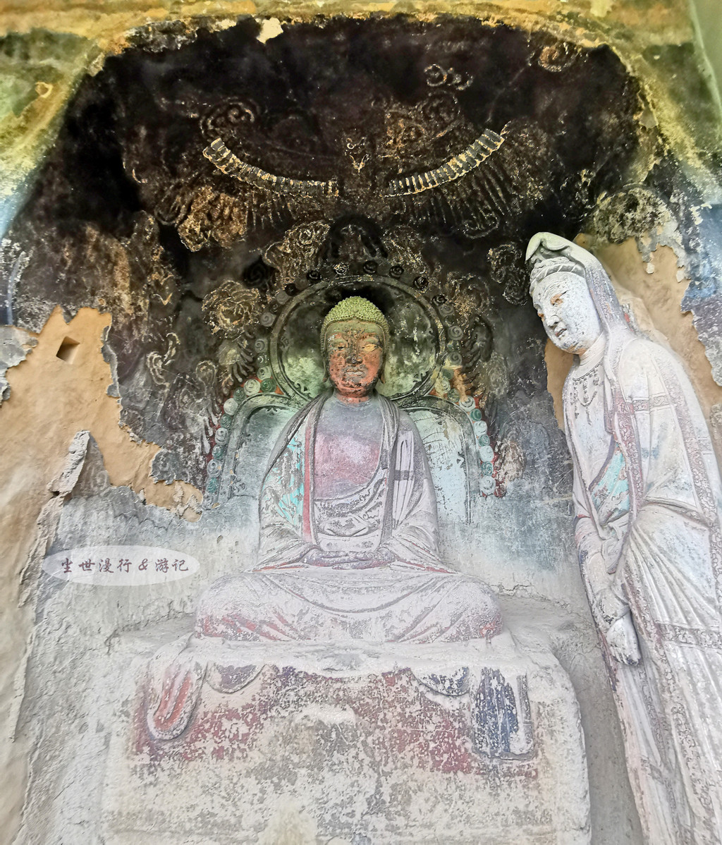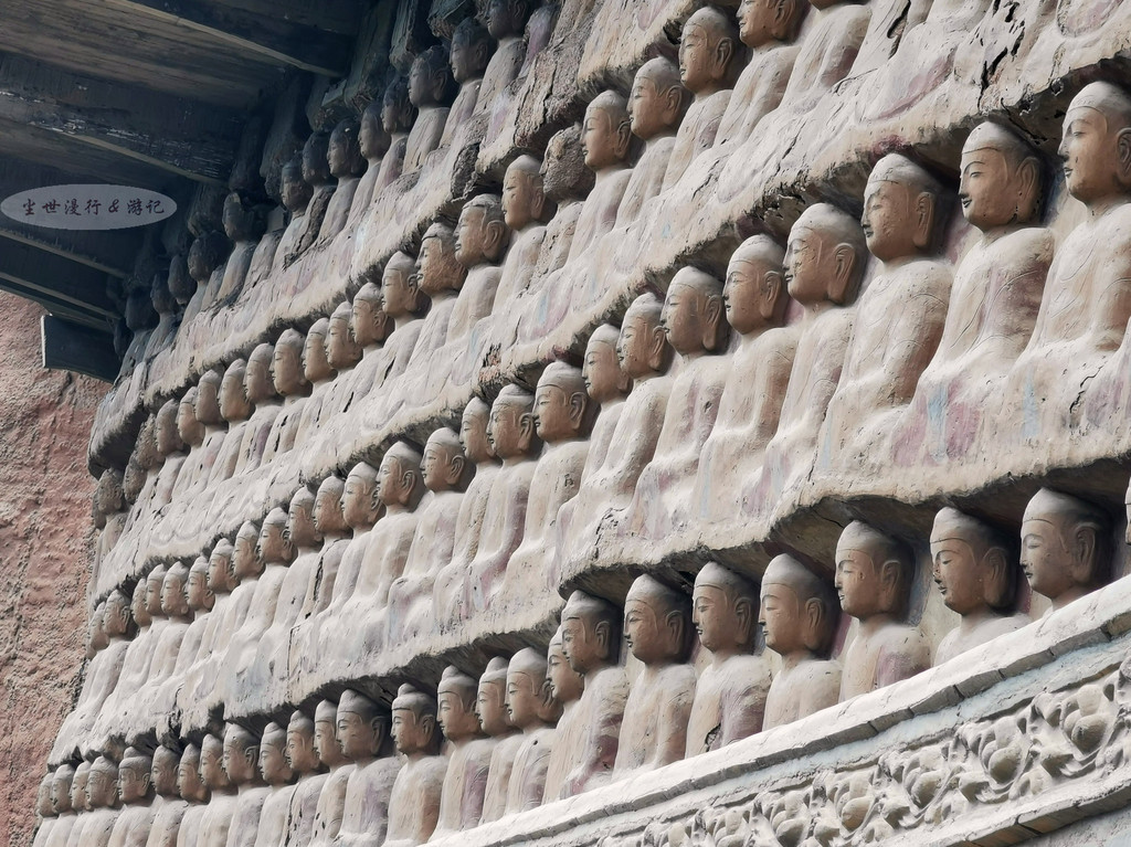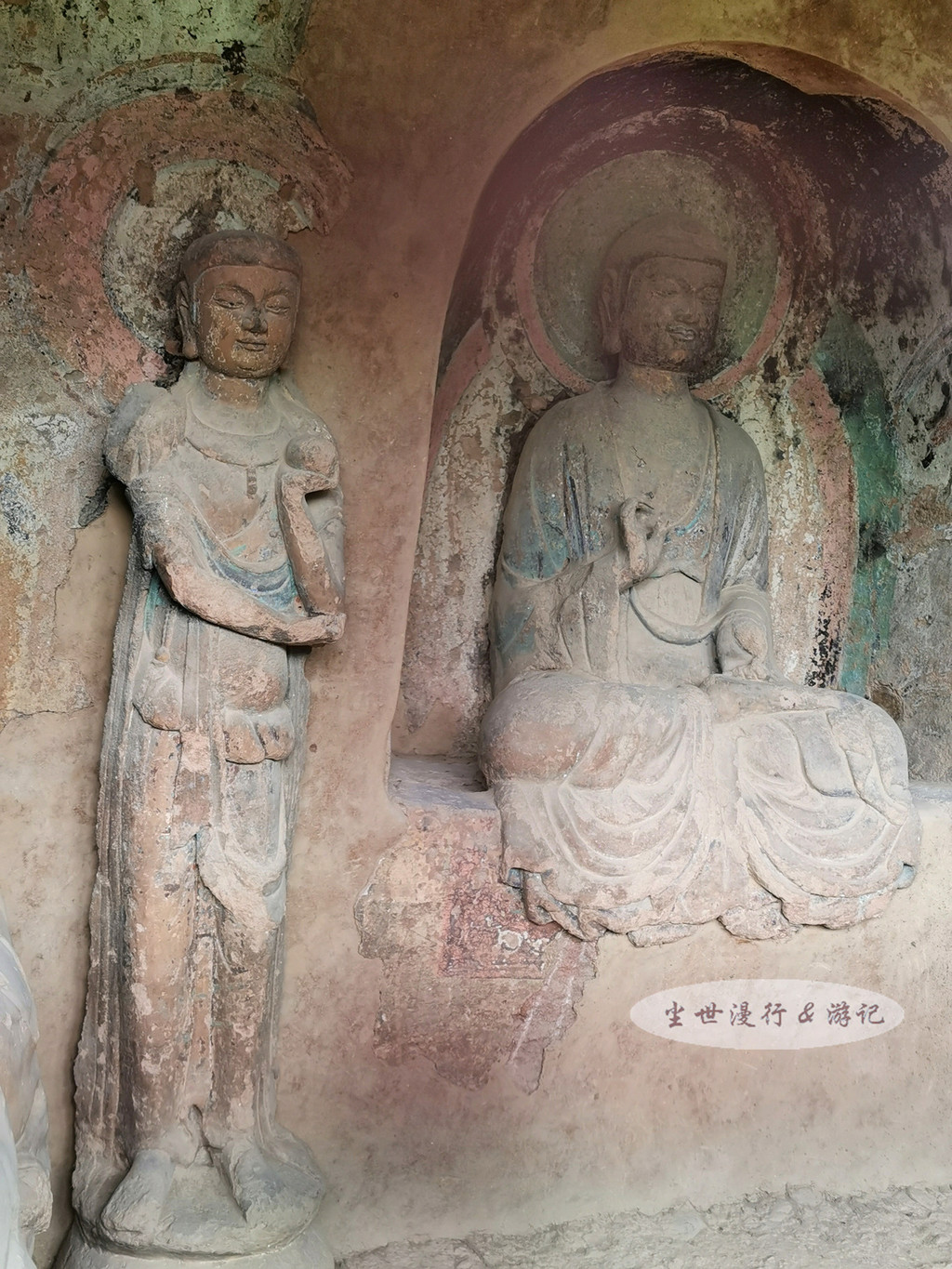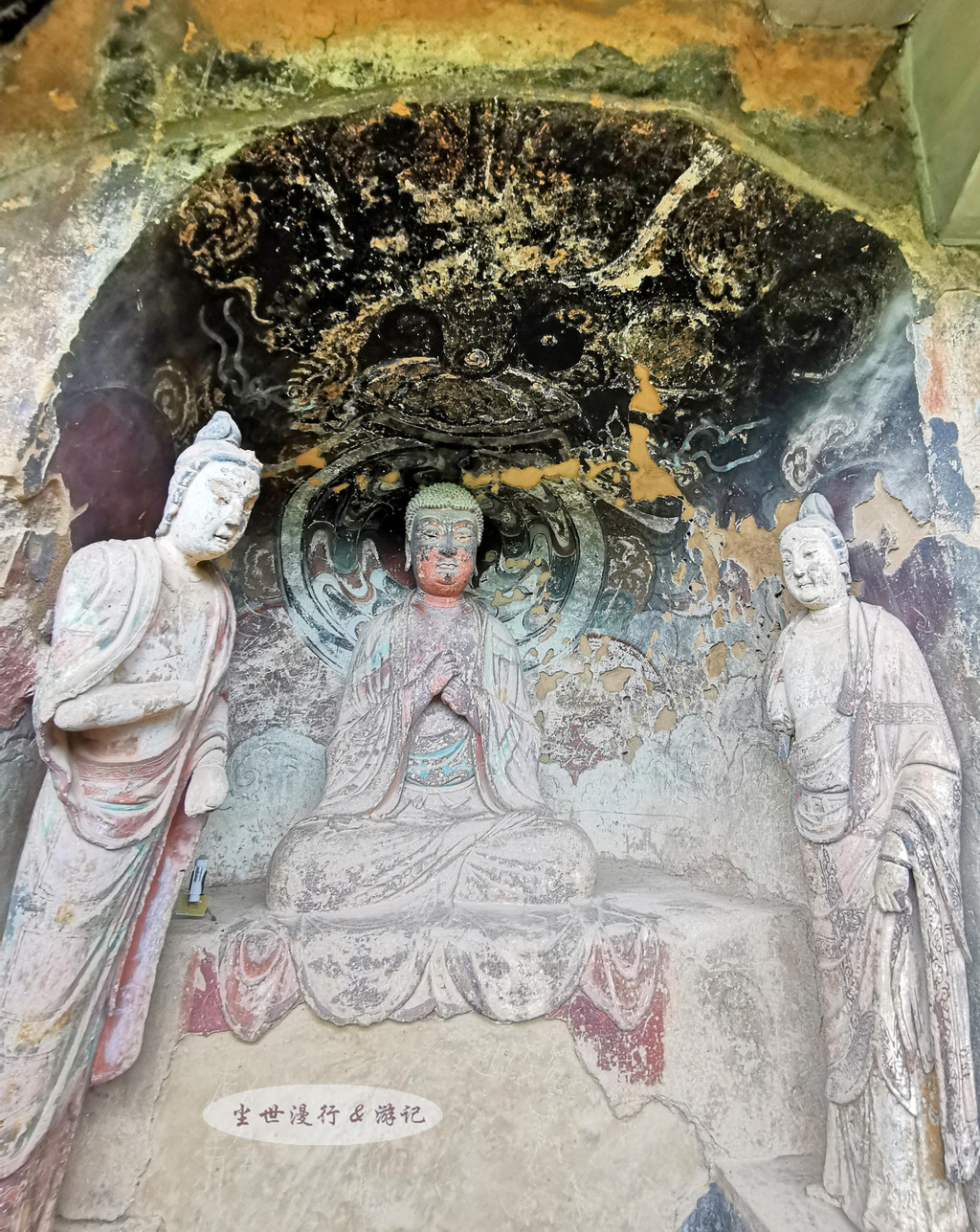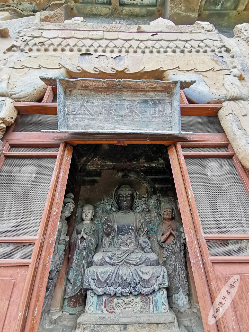 从第9窟出来向上攀爬就可见第3窟——千佛廊,开凿于北周,原有上、下六排佛像,故称“千佛廊”。千佛廊长32米,现崖壁上分两层整齐地排列着258尊石胎泥塑的神像,神情各异,栩栩如生。