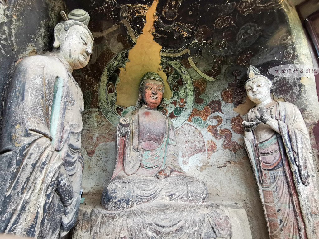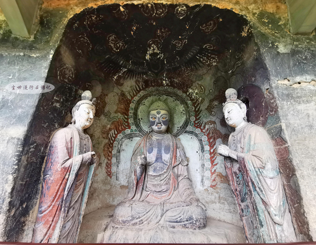 麦积山第13窟,俗称“东崖大佛”,位于东崖中部,摩崖高浮雕石胎泥塑,一佛二菩萨像,开凿于隋代,这是麦积山现存最大的一组石胎泥塑造像,在山下即清晰可见。