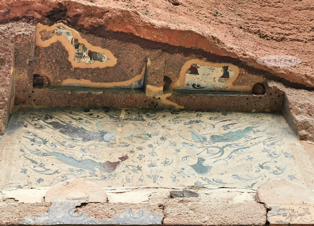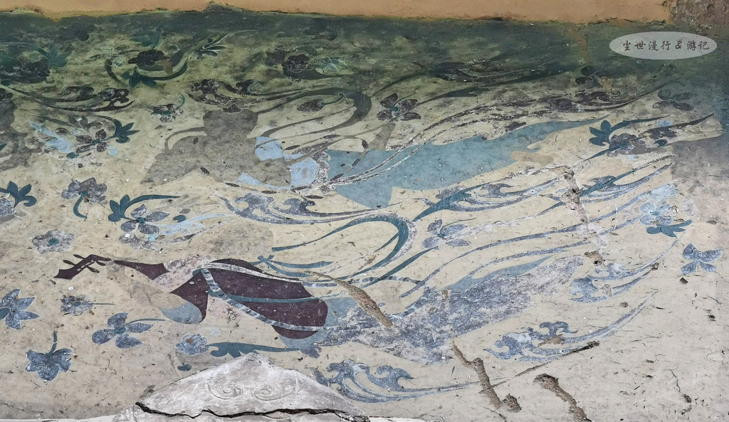 佛像顶部、身后均有壁画,约保存60平方米,明、清重绘。