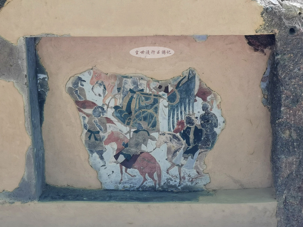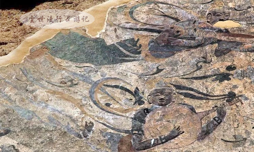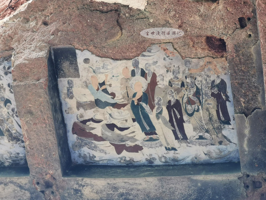 七个佛龛内壁画,全为明末清初重绘,唯诸龛外部上面的大型“薄肉塑”飞天组画及残存在前廊平棋上面的四幅佛传故事画,既为北周原作,又颇具有特色。
