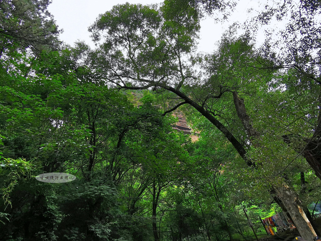 沿着步道向石窟方向走去,沿途密密的树林已隐约显出麦积山轮廓。