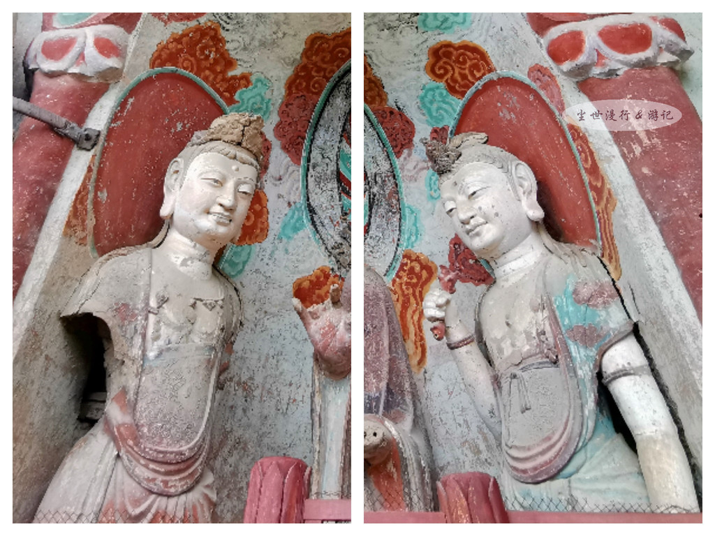 踏牛天王左、右侧的圆拱形大龛,每龛内各塑一佛二菩萨。菩萨花萝高冠,面目端庄秀丽,胸部半袒、双臂外露、肌肤丰腴。但姿态服饰有别,体形微呈型扭动曲线,婀娜多姿。尤其是右侧二菩萨的微笑,那是一种无限魅力的东方微笑。